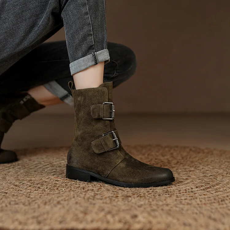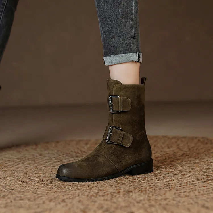 Amozae 2022 Autumn Winter Round Toe Women Boots Chunky Heel Shoes For Women Short Boots Belt Buckle Low Heels Sheep Suede Knight Boots