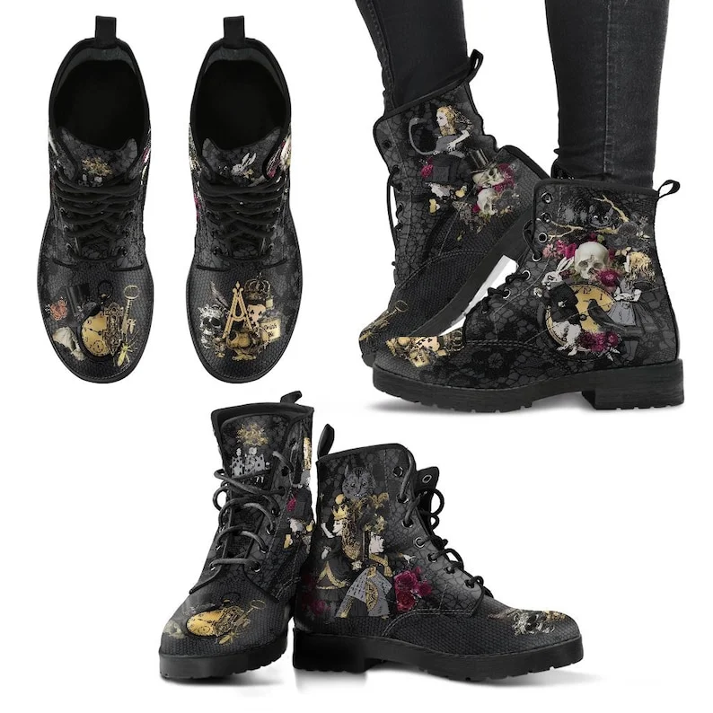 Amozae Skull Flower Print High-Top Boots Women Boot Autumn Winter Fashion Women Tooling Ankle Boots Women Boots Women Botas Mujer