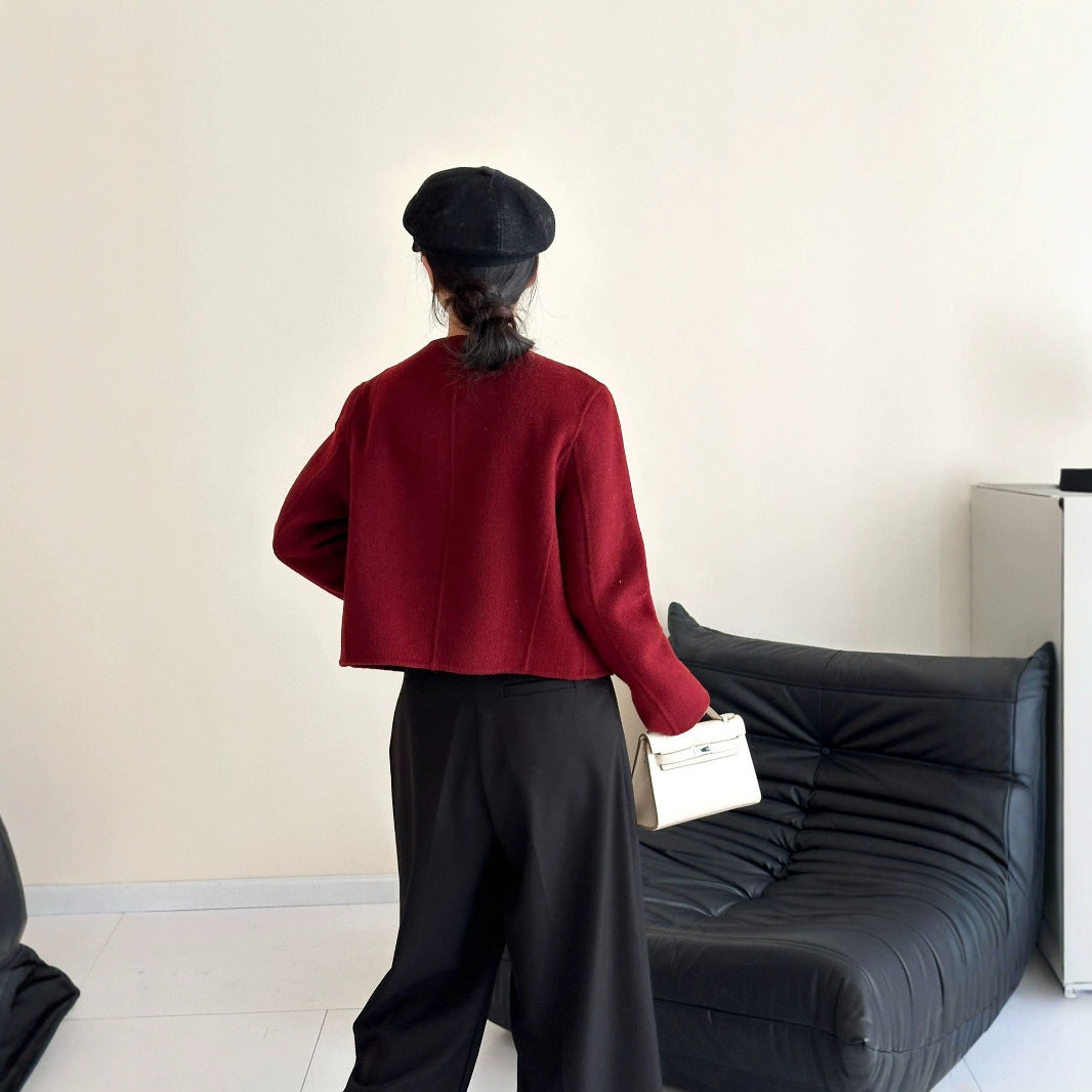 2025 Collarless zipper solid color small short high-end double-sided wool woolen coat jacket women's warm autumn and winter