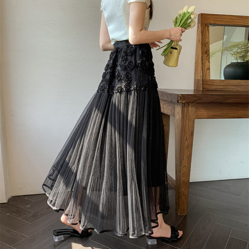 2025 fashion versatile three-dimensional flower mesh skirt women's spring wear high waist thin small long skirt