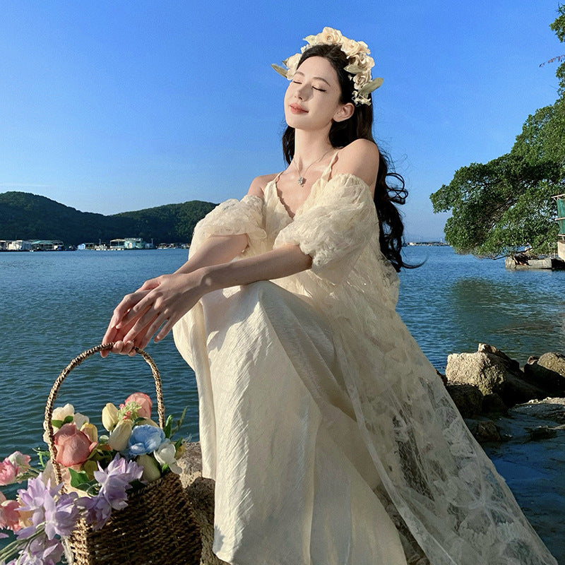 2025 High-end heavy industry butterfly embroidery off-the-shoulder suspender dress for women's summer super fairy Sanya seaside photo long skirt