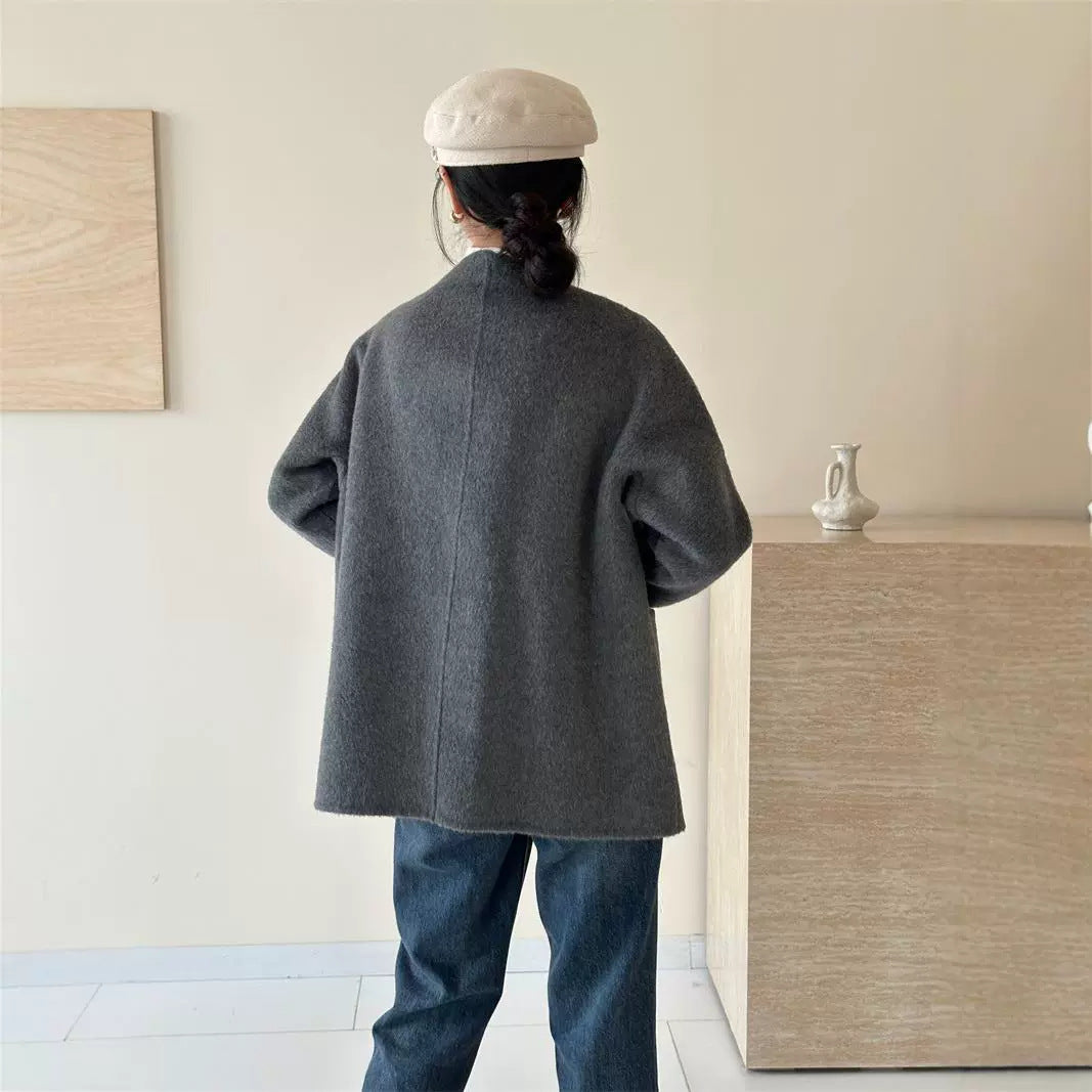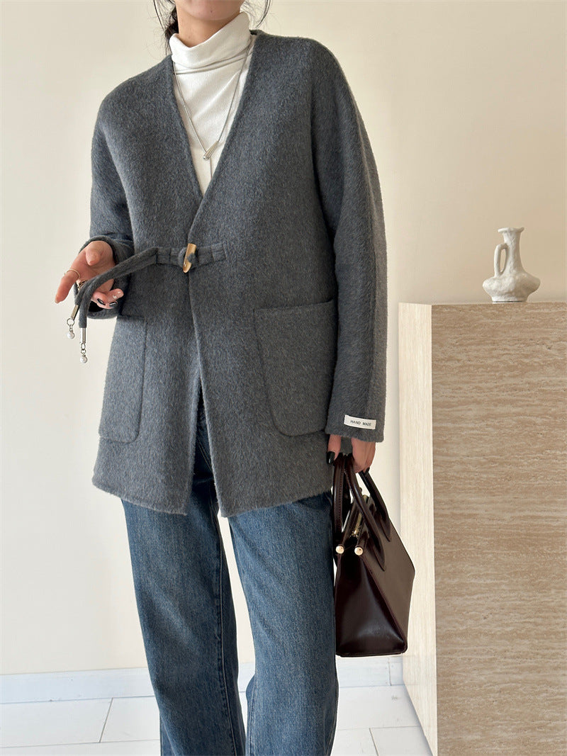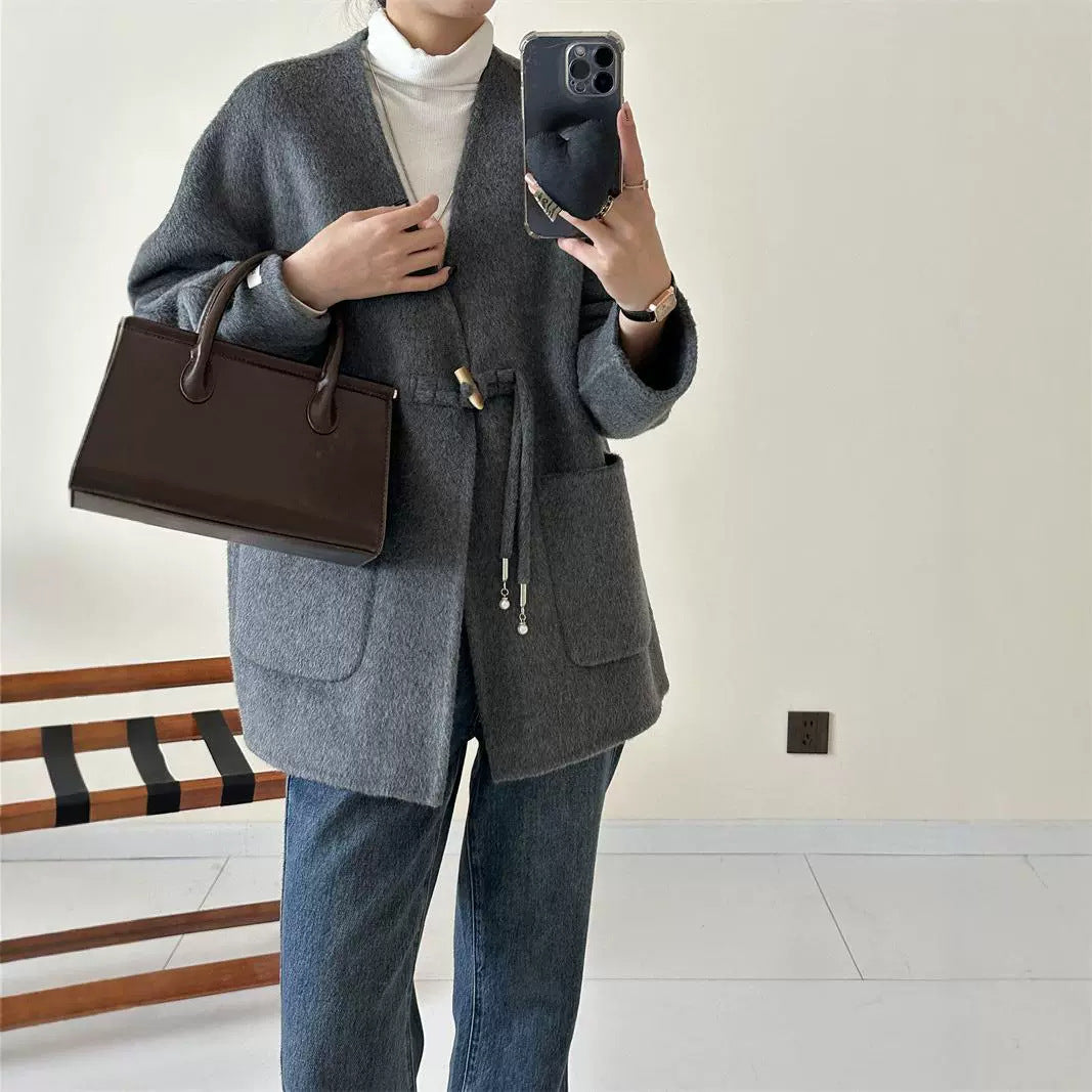 2025 Solid color V-neck lace-up horn buckle, national style double-sided wool woolen jacket, premium women's casual jacket to keep warm in autumn and winter