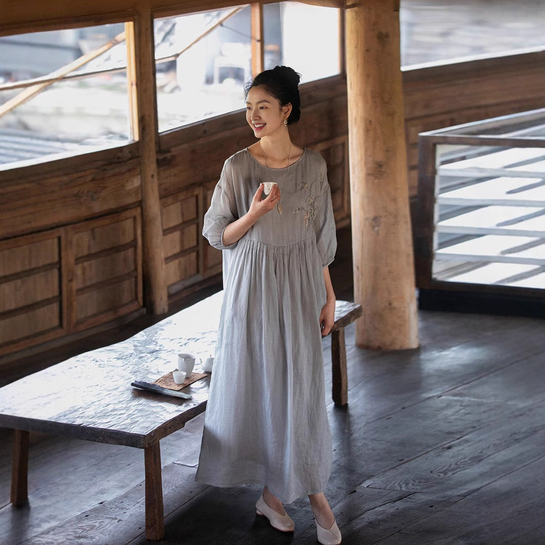 2025 spring and summer new product embroidery pure ramie gentle wind dress women's summer light and thin round neck loose long dress B0458