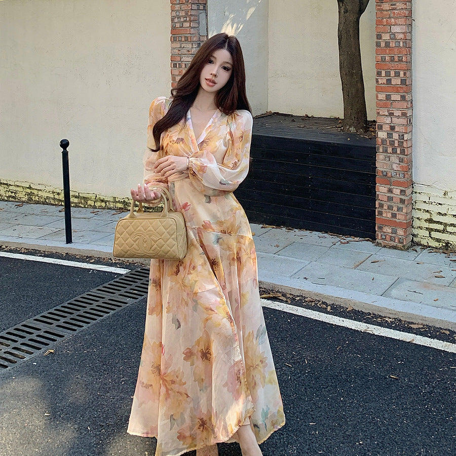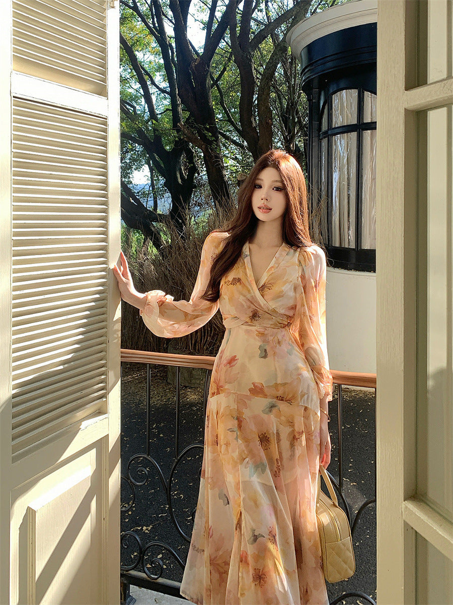 2025 Super good-looking floral long-sleeved dress for women's autumn, unique and beautiful, gentle wind, retro coffee break, temperament long skirt