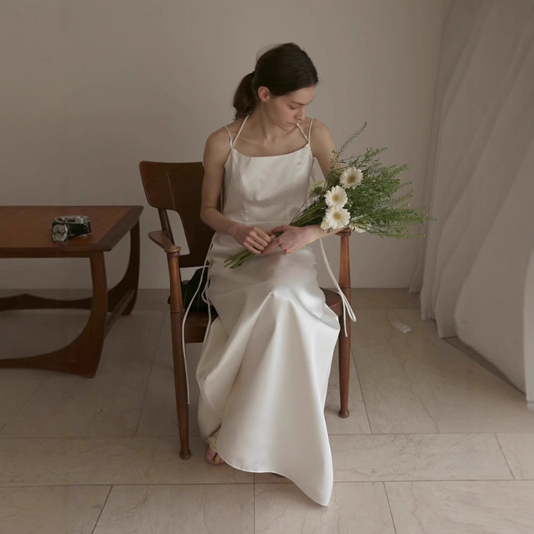 2025 Temperament suspender wedding dress satin engagement certificate simple white gauze dress lawn wedding literary travel photography light wedding dress