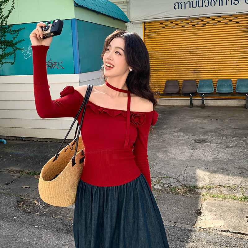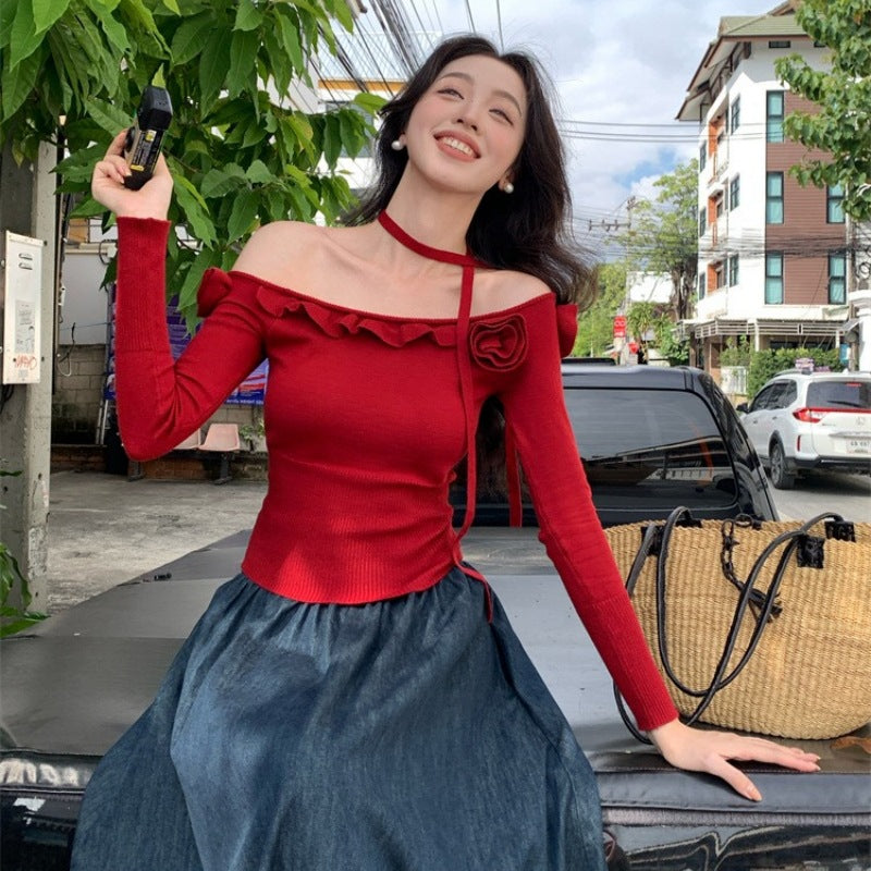 2025 Thirteen Lines Spring New One-Neck Three-dimensional Flower ins Slim-fit Knitted Sweater Sweater 25208