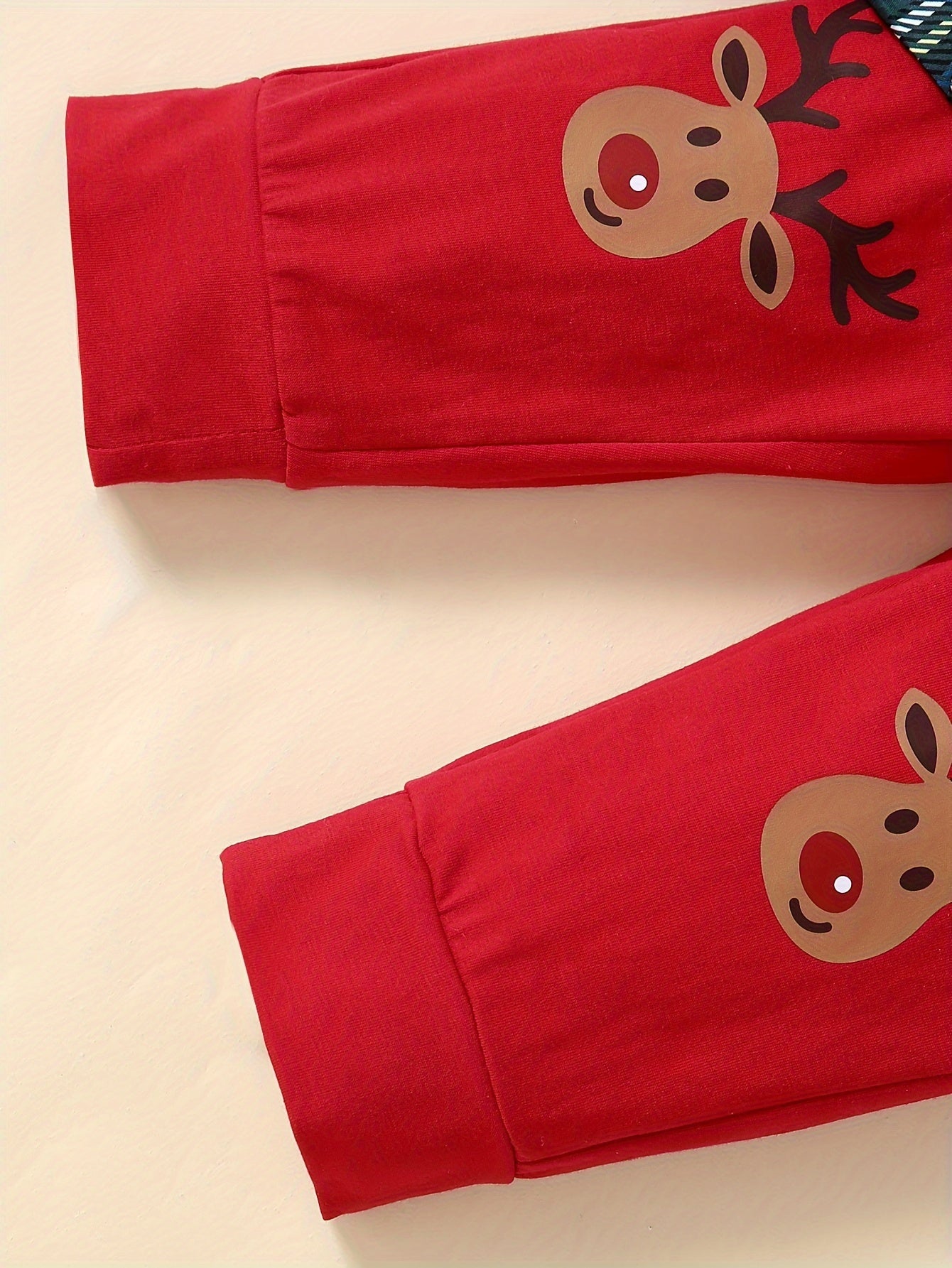 2pcs Baby's Christmas Style Plaid Pattern Bodysuit & Casual Cartoon Elk Print Overalls, Toddler & Infant Boy's Clothing Set, Outdoor Cloth