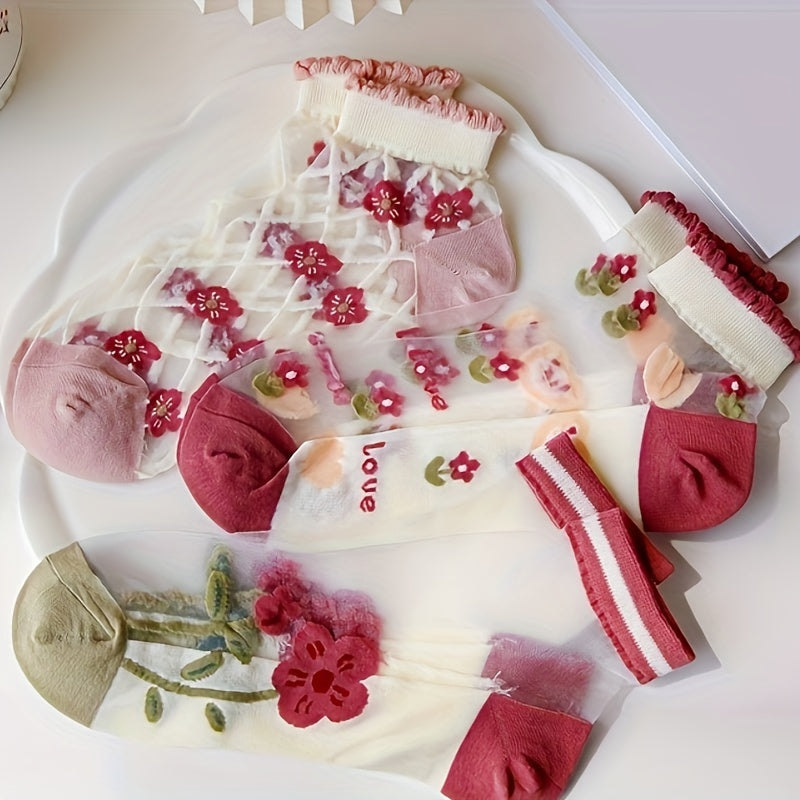 3/5 Pairs Of Teenager's Cute Low-cut Ankle Socks, Ultra-thin Silk Sweet Bear & Floral Design, Soft Comfy Cotton Blend Socks For Summer