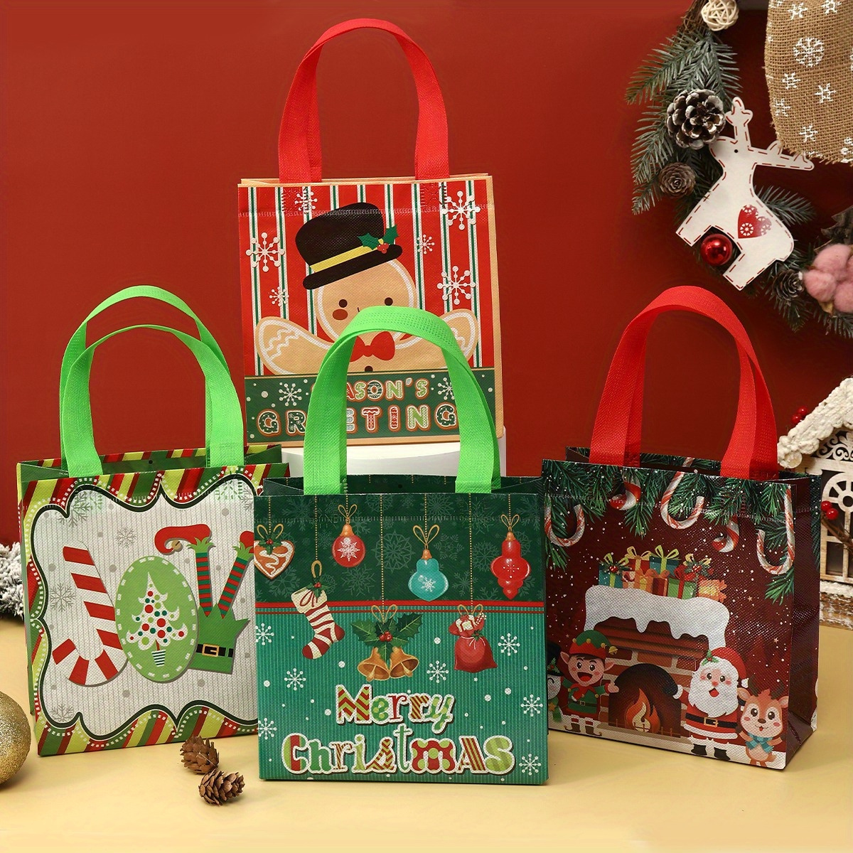 4pcs Christmas Reusable Tote Bags - Non-Woven Polyester Blend Holiday Gift Bags with Handles - Waterproof Goodie Bags with Retro Seasonal Designs for General Use and Festive Occasions