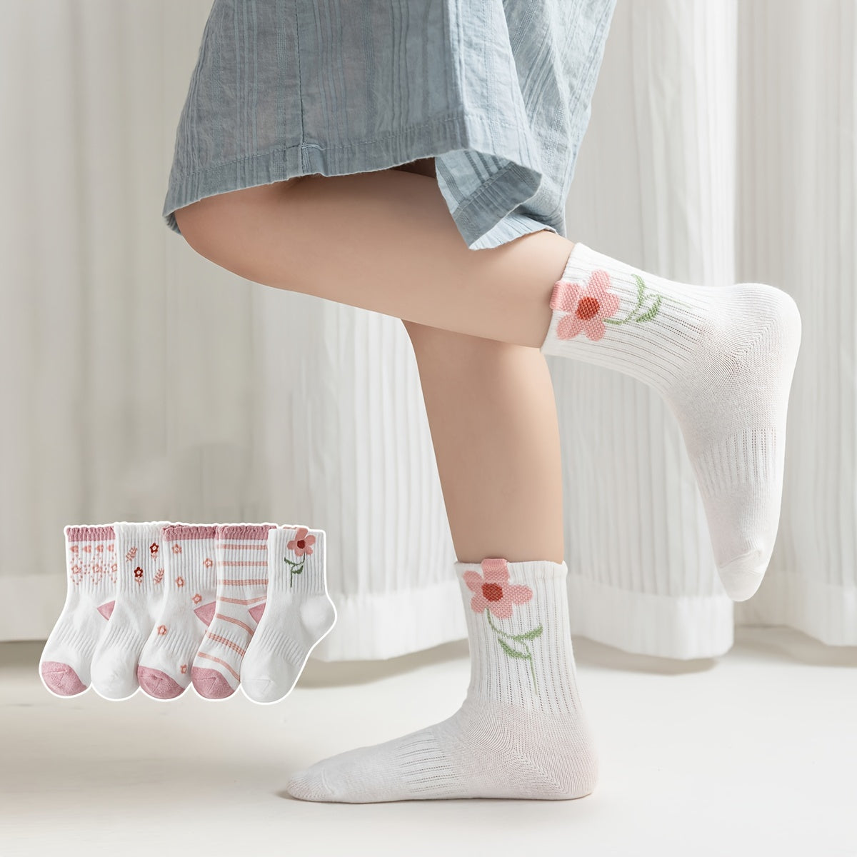 5 Pairs Of Kid's Cotton Blend Fashion Cute Floral Pattern Crew Socks, Comfy & Breathable Soft & Elastic Thin Socks For Spring And Summer