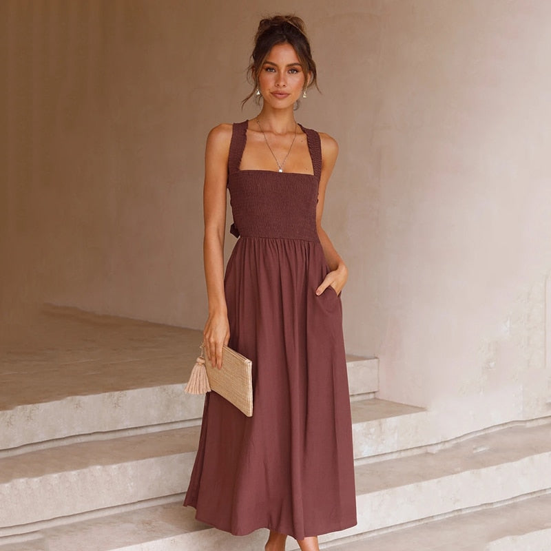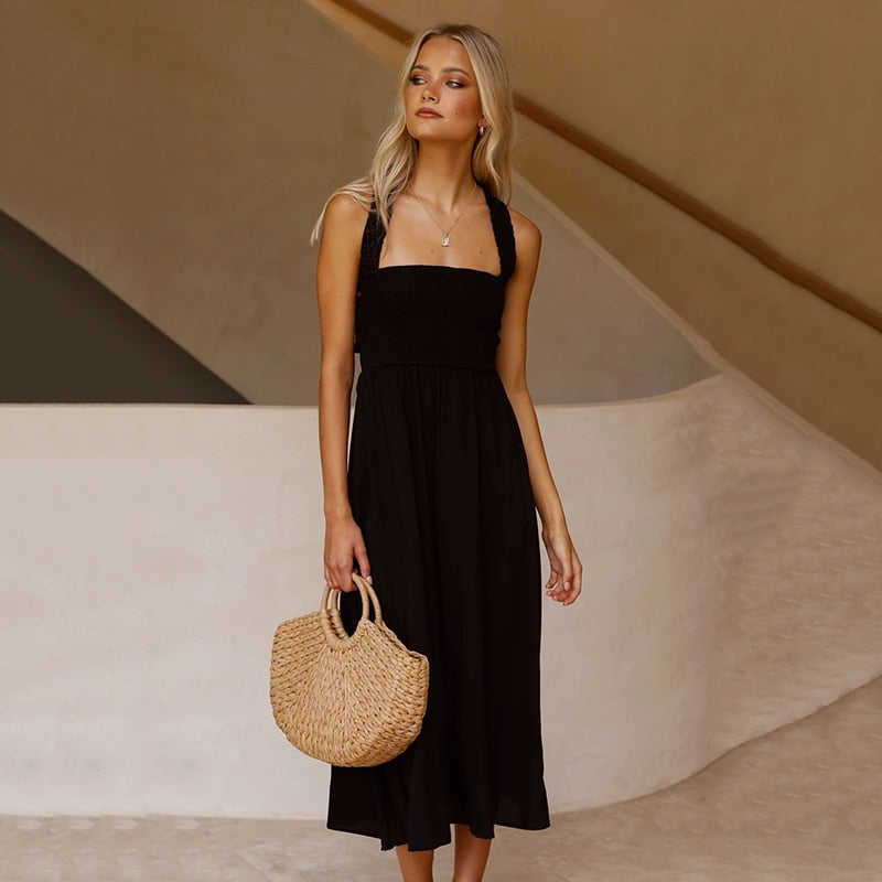 Back to college Elegant Halter Neck Sleeveless A-Line Summer Midi Dress Women Black Backless Lace Up Boho Spaghetti Party Dresses Vestidos