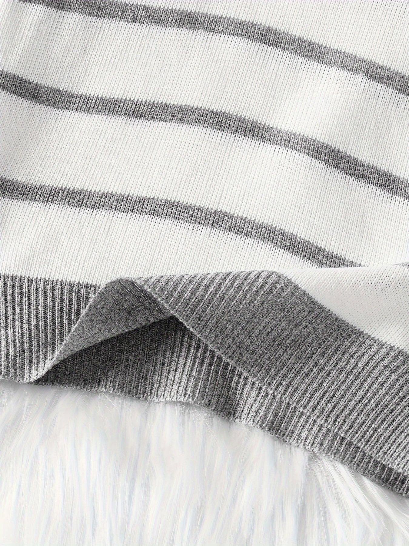 Baby Boys Comfortable & Casual Grey And White Striped Crew Neck Knitted Sweater For Outing Activities