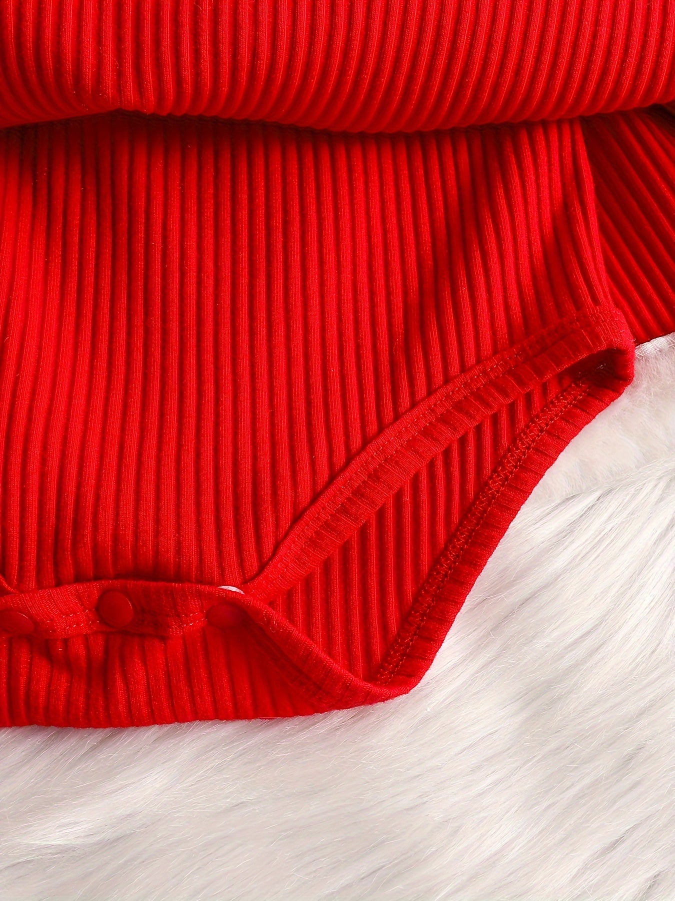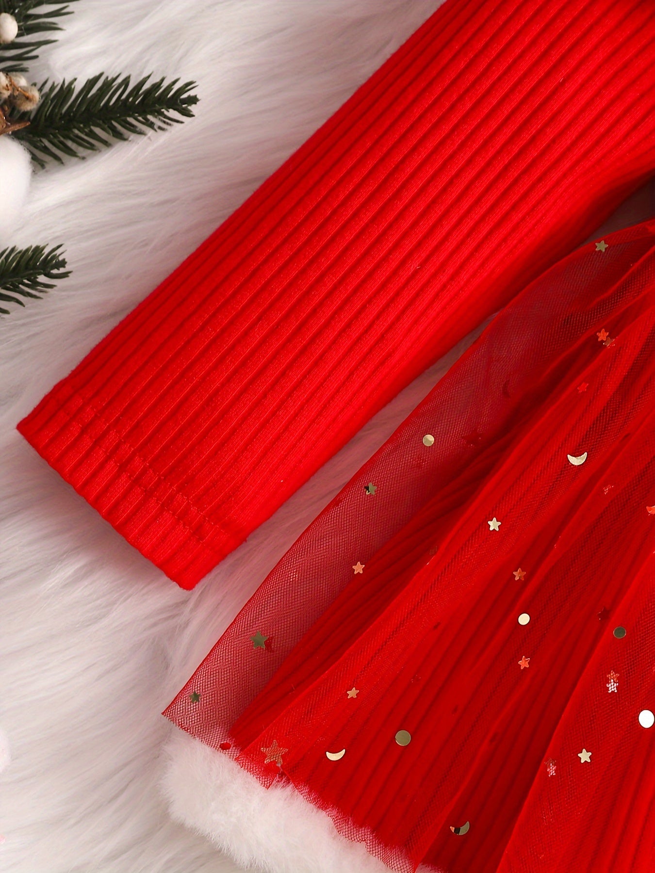 Baby's Christmas Style Fuzzy Trim Ruffled Long Sleeve Romper Dress, Toddler & Infant Girl's Onesie For Winter Festival Party & Outdoor Play