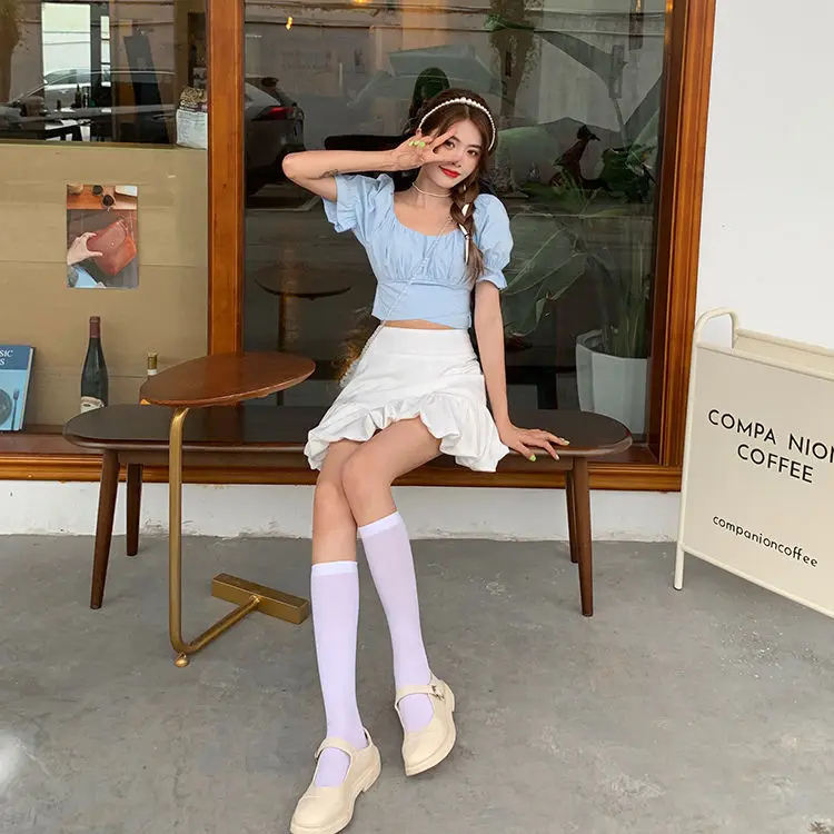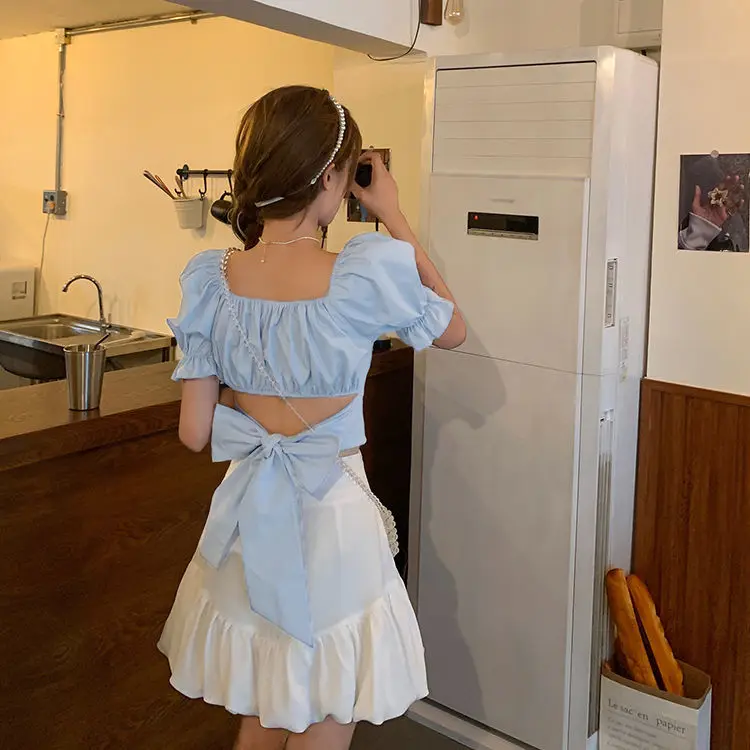 flowersverse Back Puff Sleeve Shirts Women Autumn French Bow Bandage Blouses New Black Pink Square Neck Cropped Tops Female