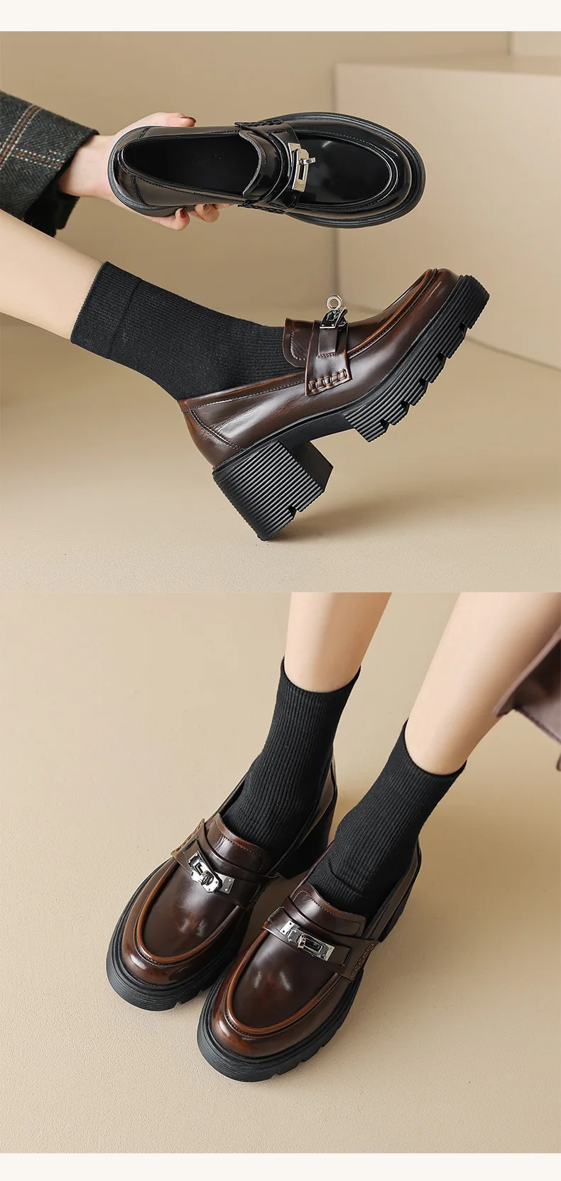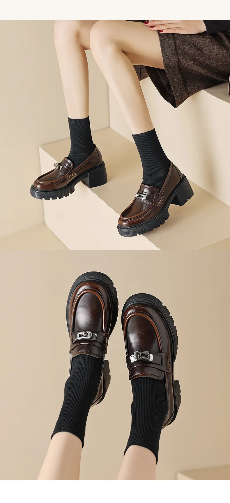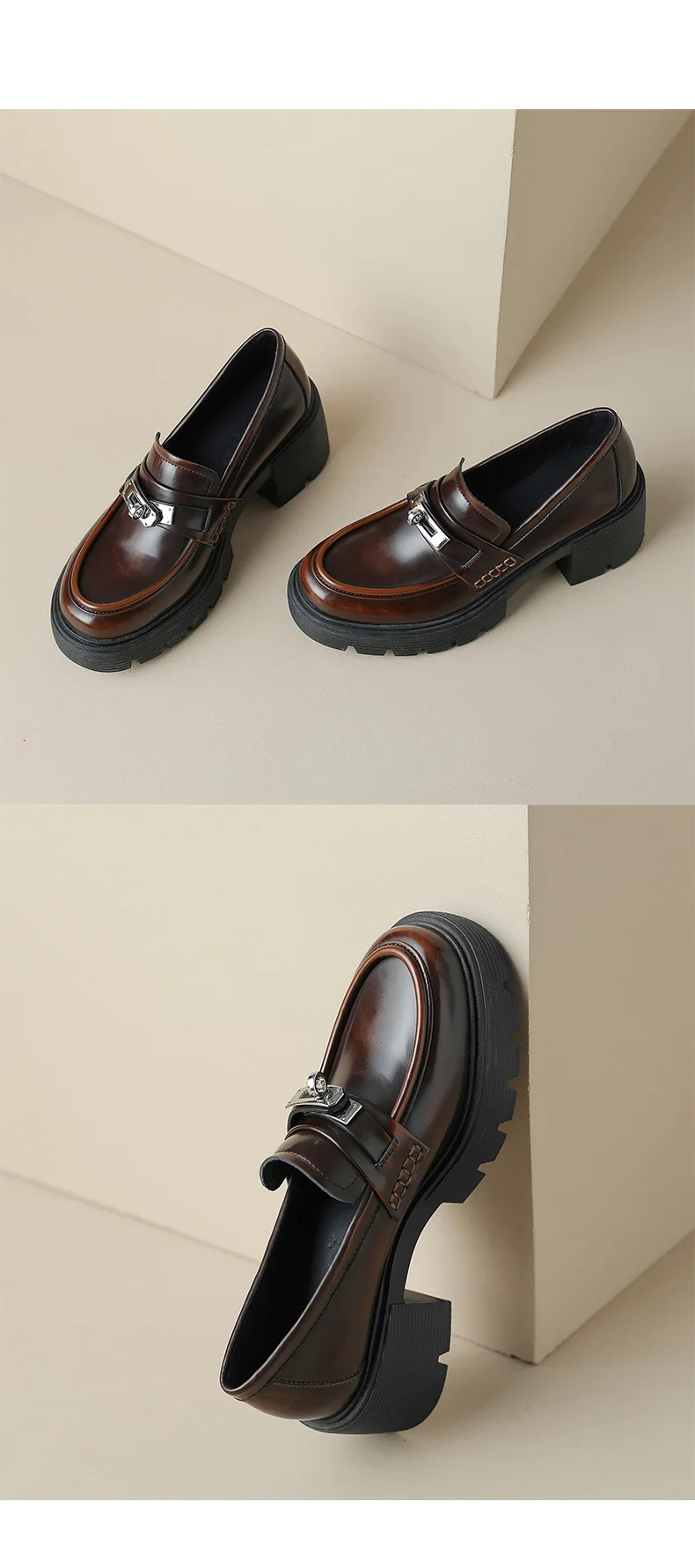 Back to school Spring women pumps natural leather 22-24.5cm Vintage waxed cowhide + pigskin full leather loafers women shoes thick heels