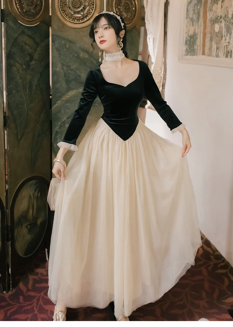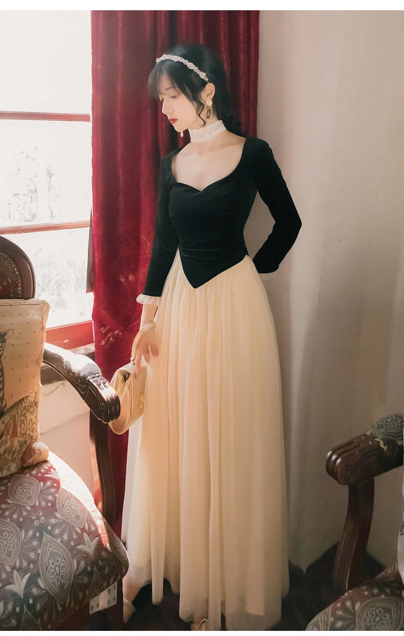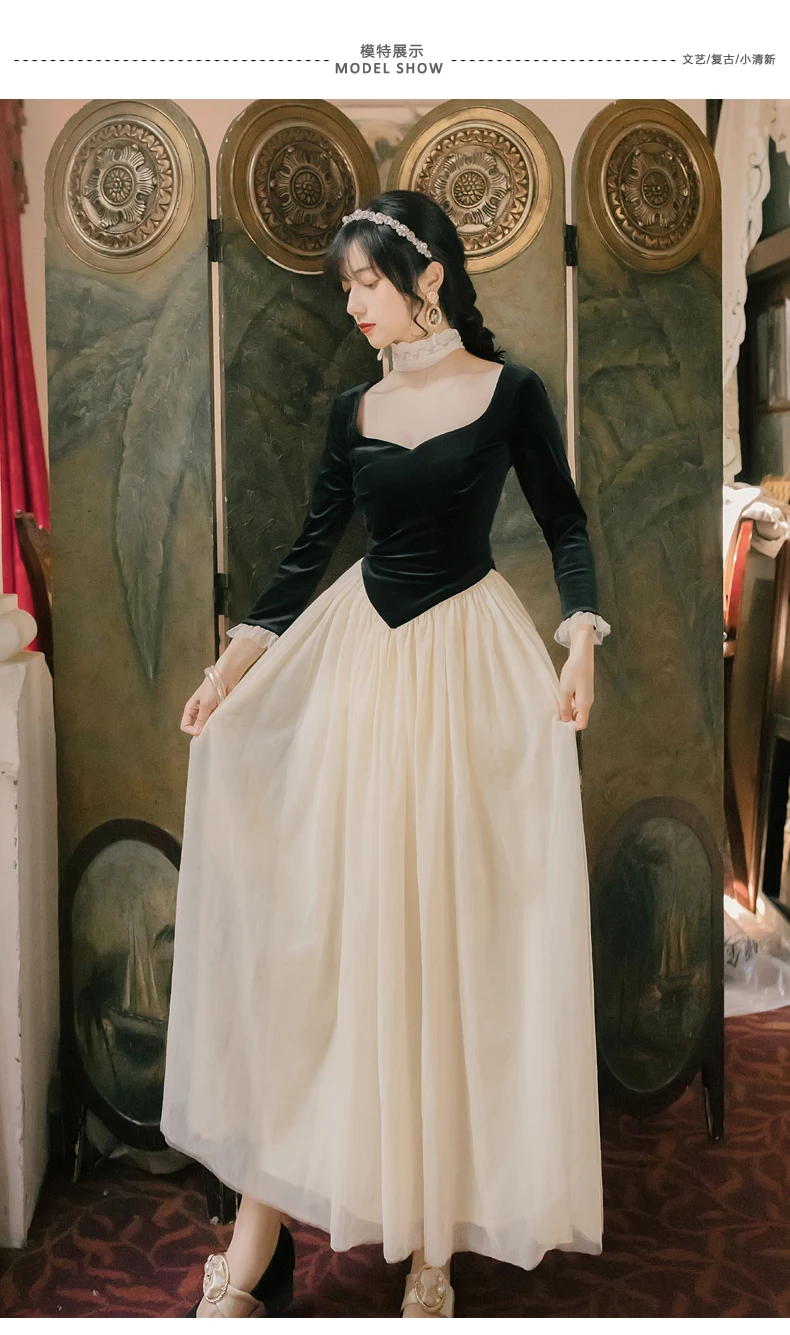 flowersverse Back to school outfit Ballet Lady Dance Dress Black Velvet Patchwork Mesh Square Collar Petal Sleeve Vintage Princess Dresses For Date Birthday Party