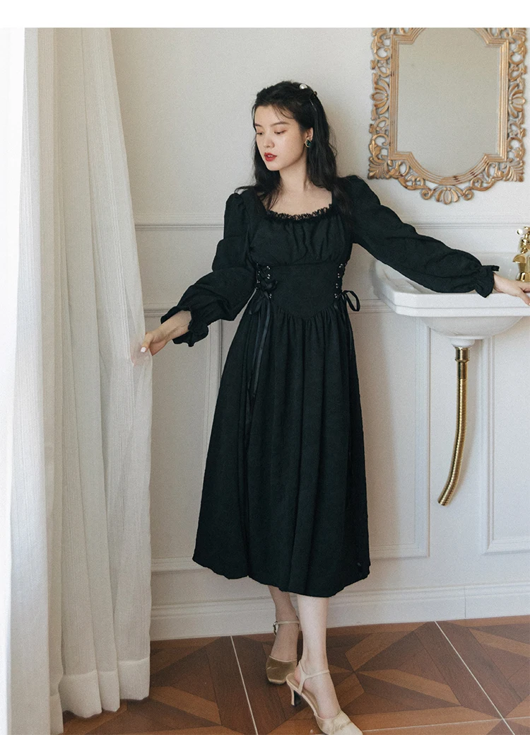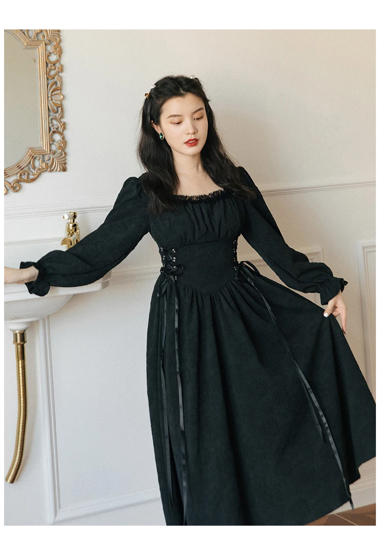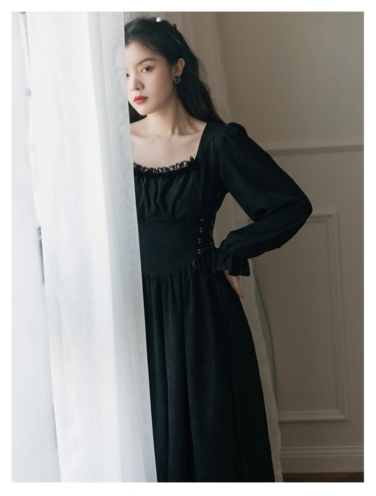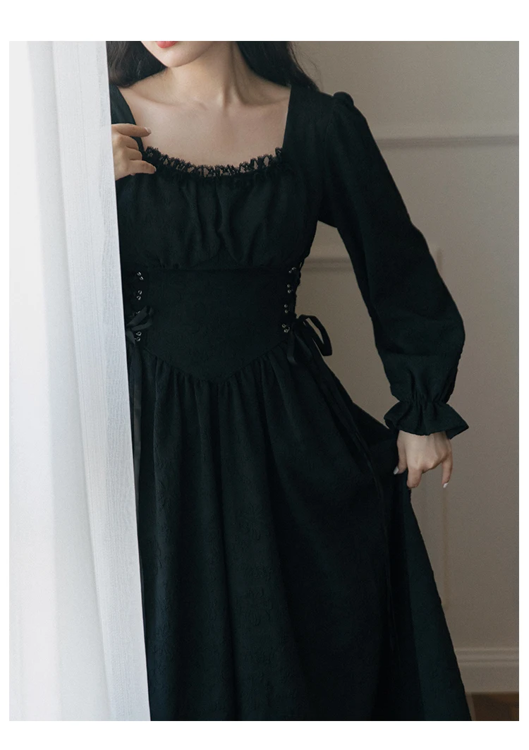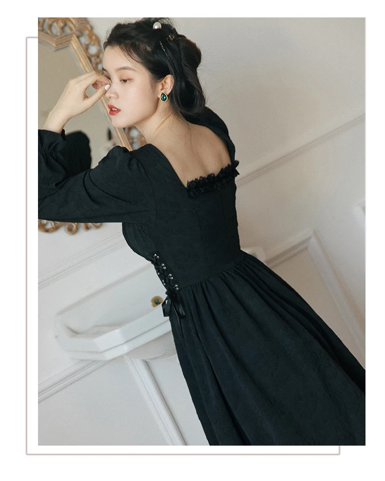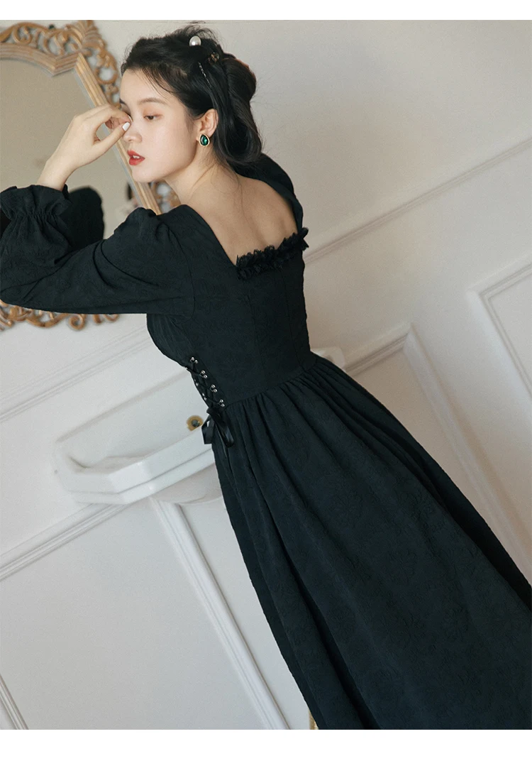flowersverse Back to school outfit Black & White Jacquard Vintage Lady Dress Retro Royal Style Square Collar Petal Sleeve Bandage Princess Dresses For Party Night