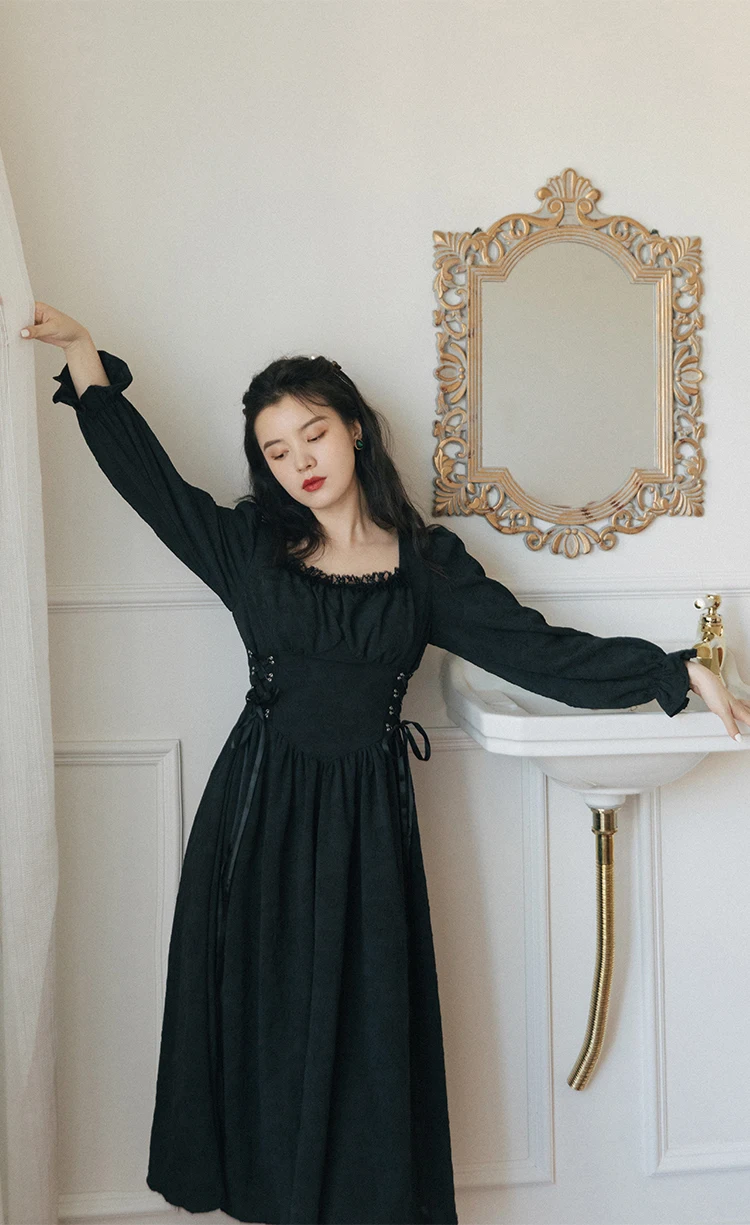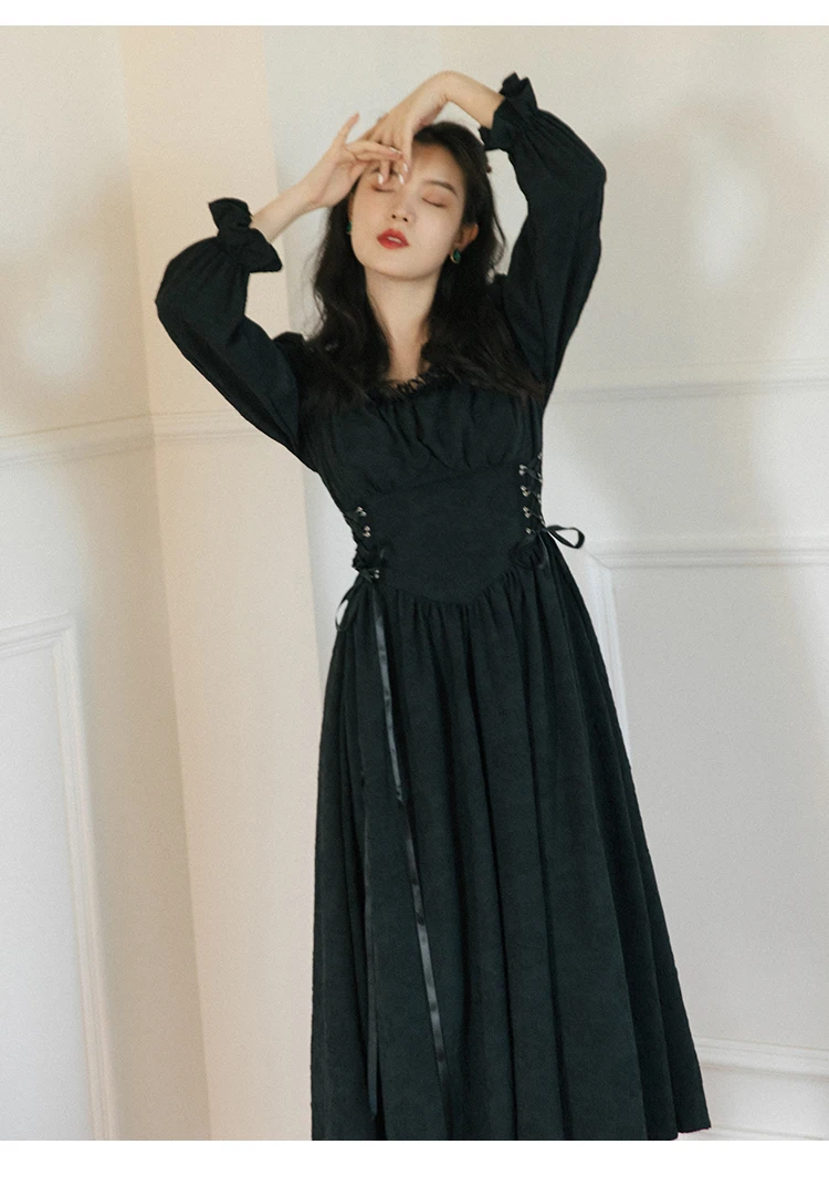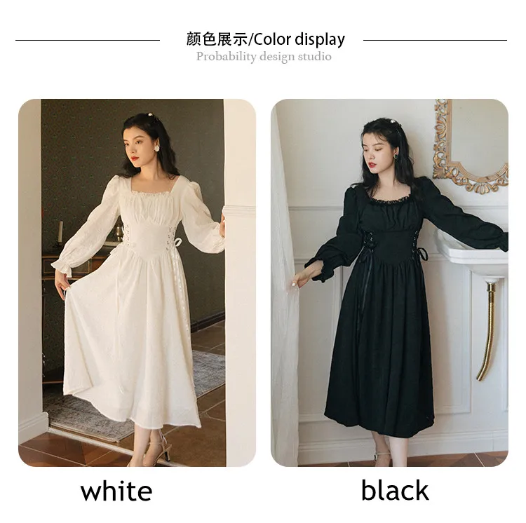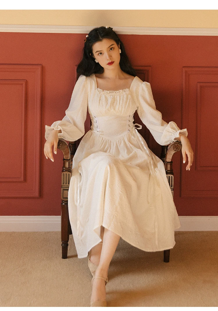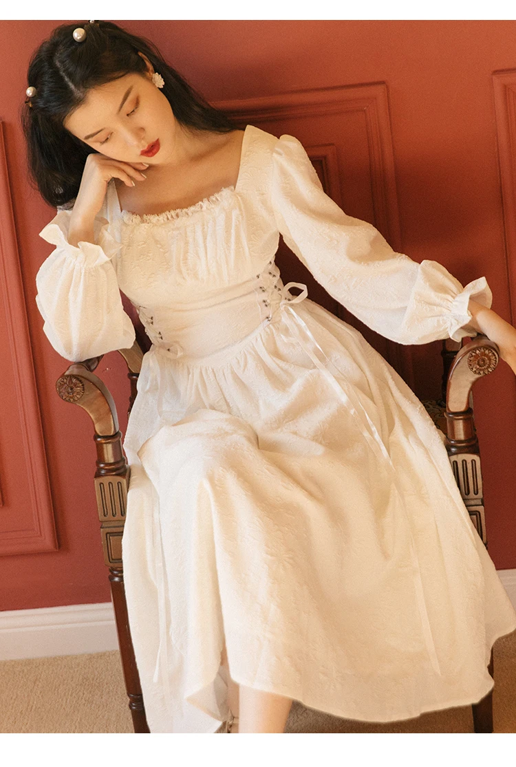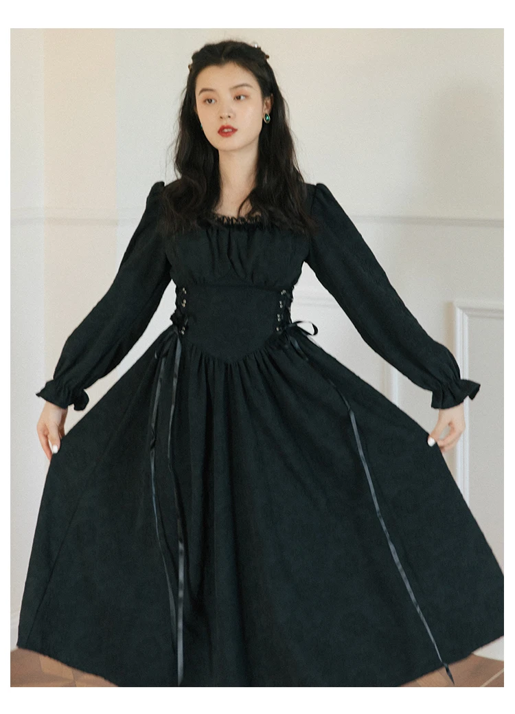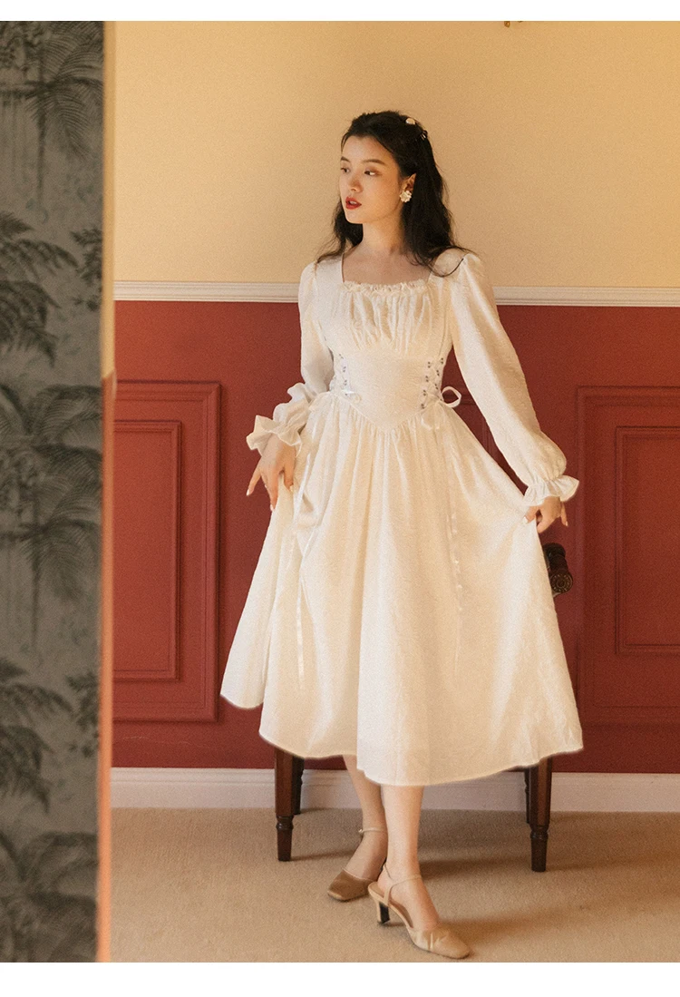 flowersverse Back to school outfit Black & White Jacquard Vintage Lady Dress Retro Royal Style Square Collar Petal Sleeve Bandage Princess Dresses For Party Night