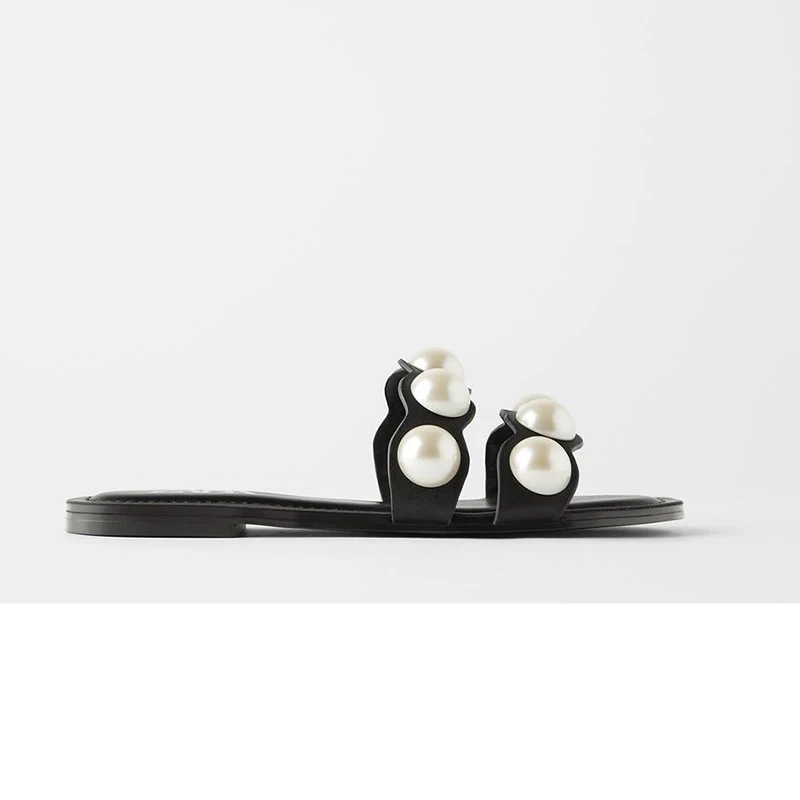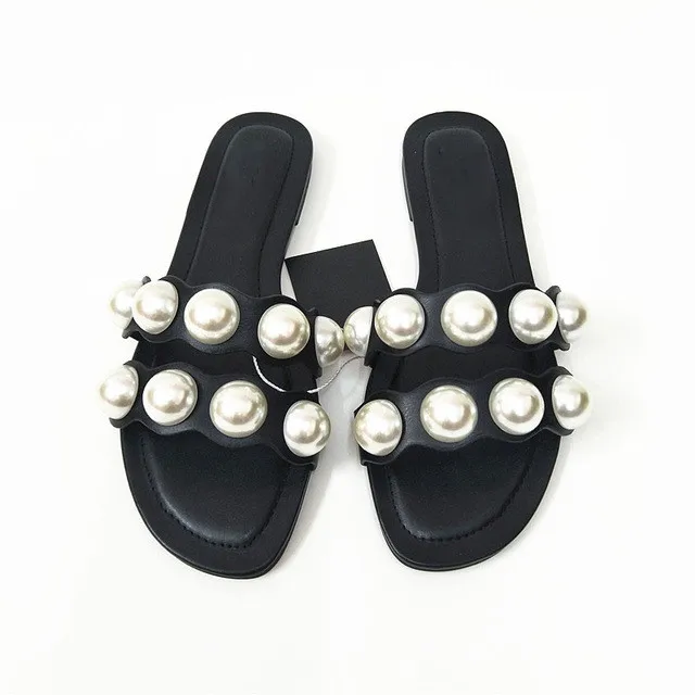 flowersverse Fashion Flat Slippers Party shoes Fulgurant Pearl Sandals thin Belt Roman Flat Women Flip Flops Casual Beach