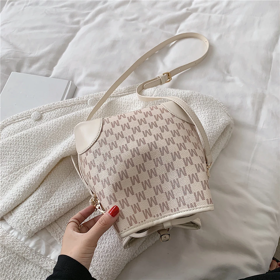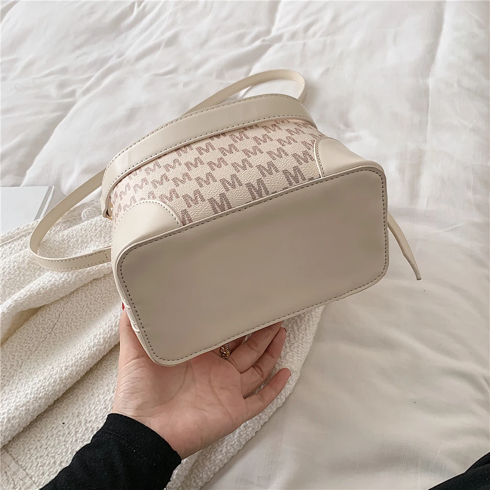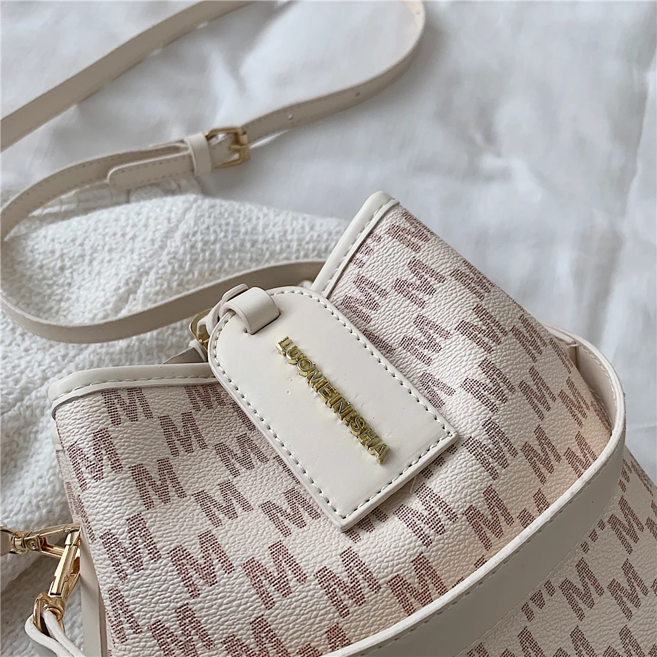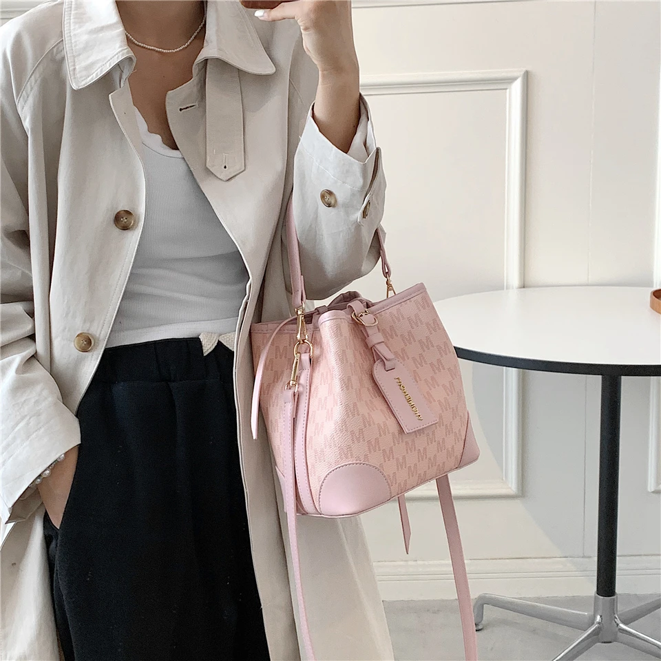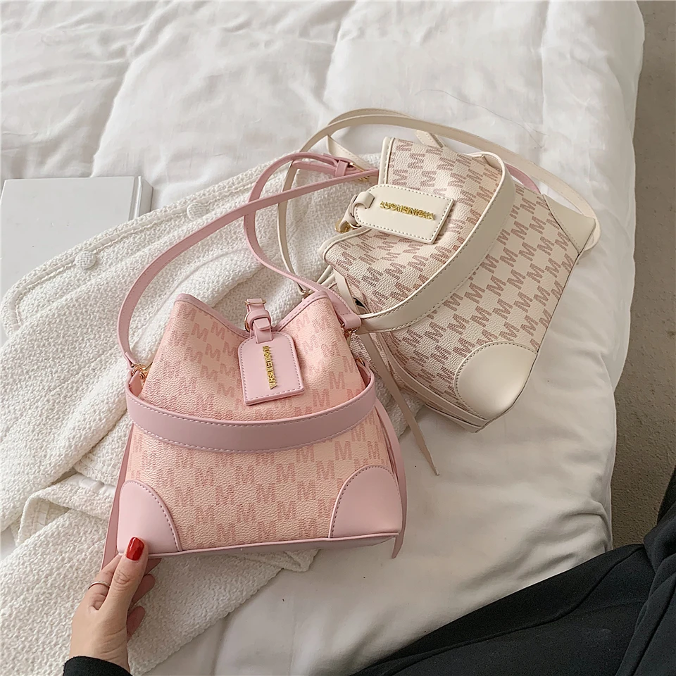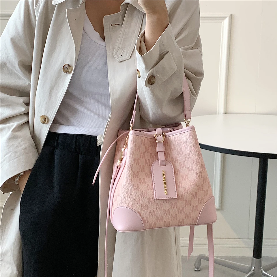 flowersverse Back to school Letters Drawstring Bucket Small Women Handbags Trend Fashion Designer Ladies Shoulder Crossbody Bags Pink Beige