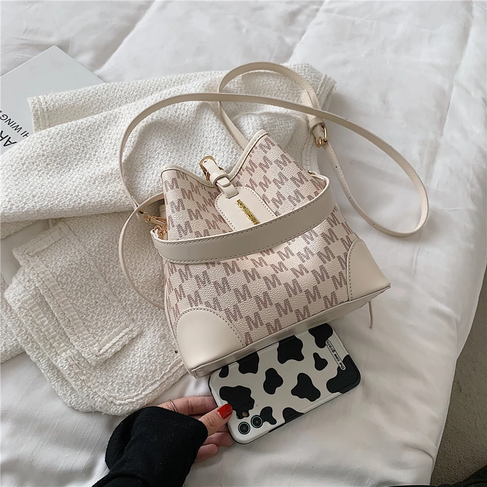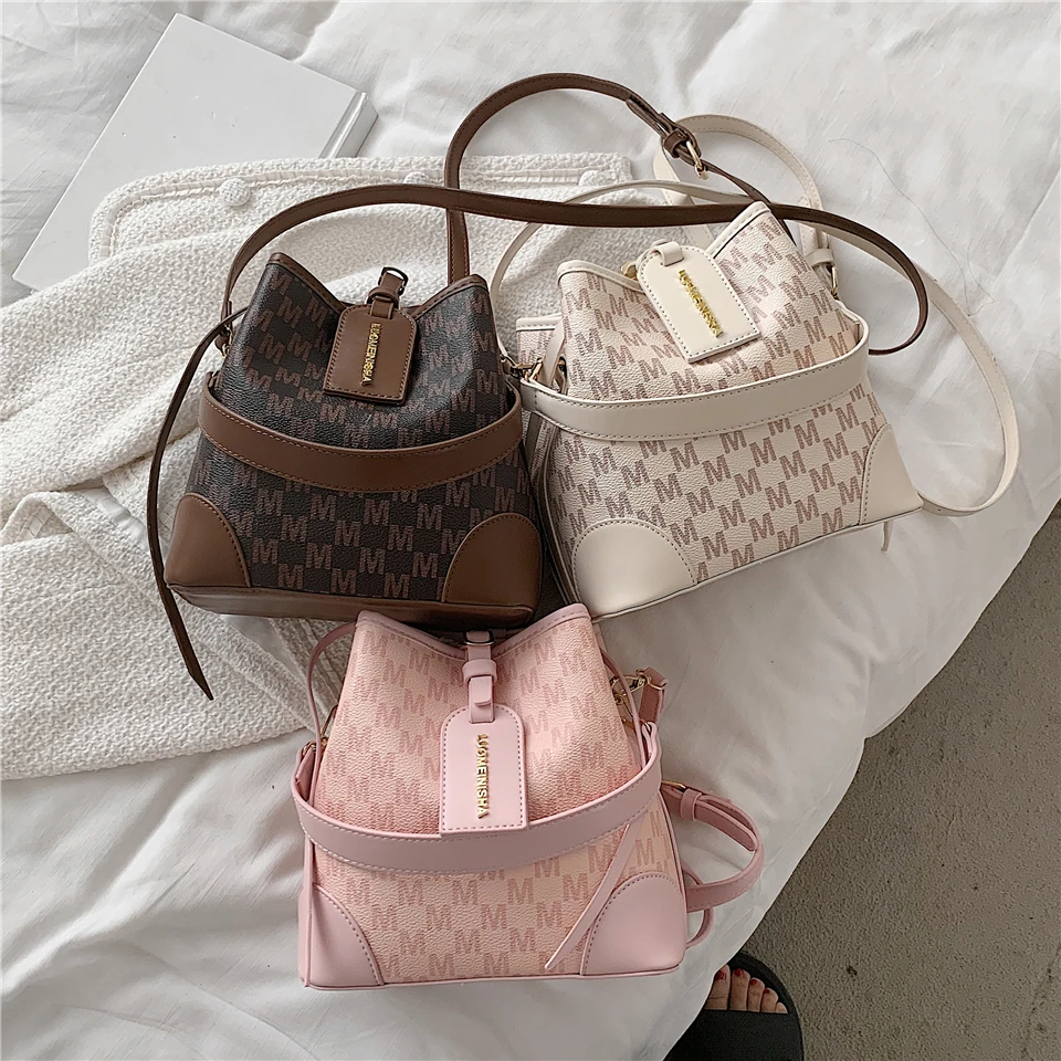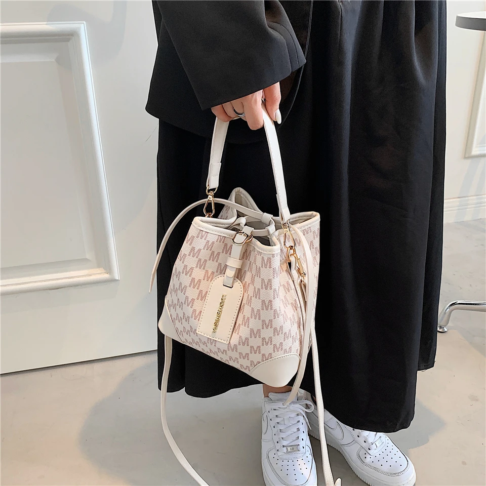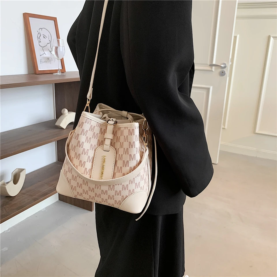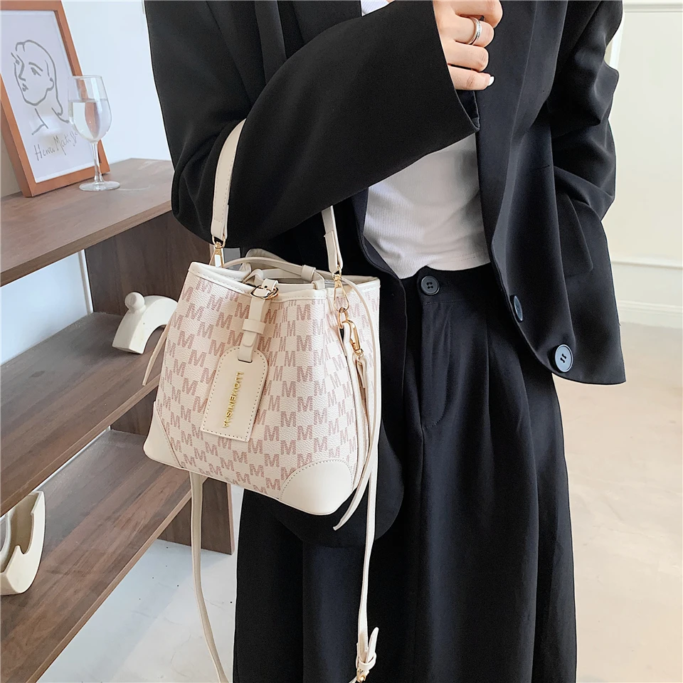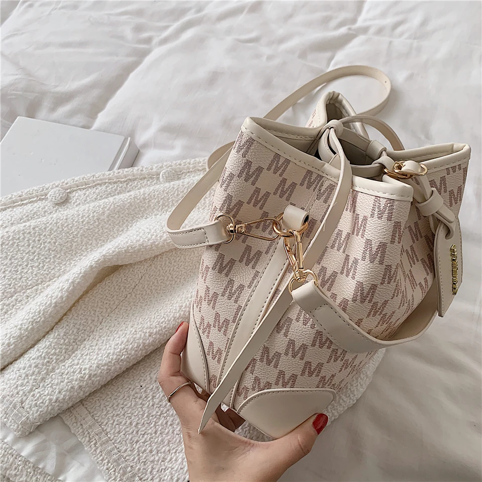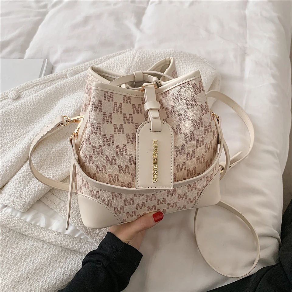flowersverse Back to school Letters Drawstring Bucket Small Women Handbags Trend Fashion Designer Ladies Shoulder Crossbody Bags Pink Beige