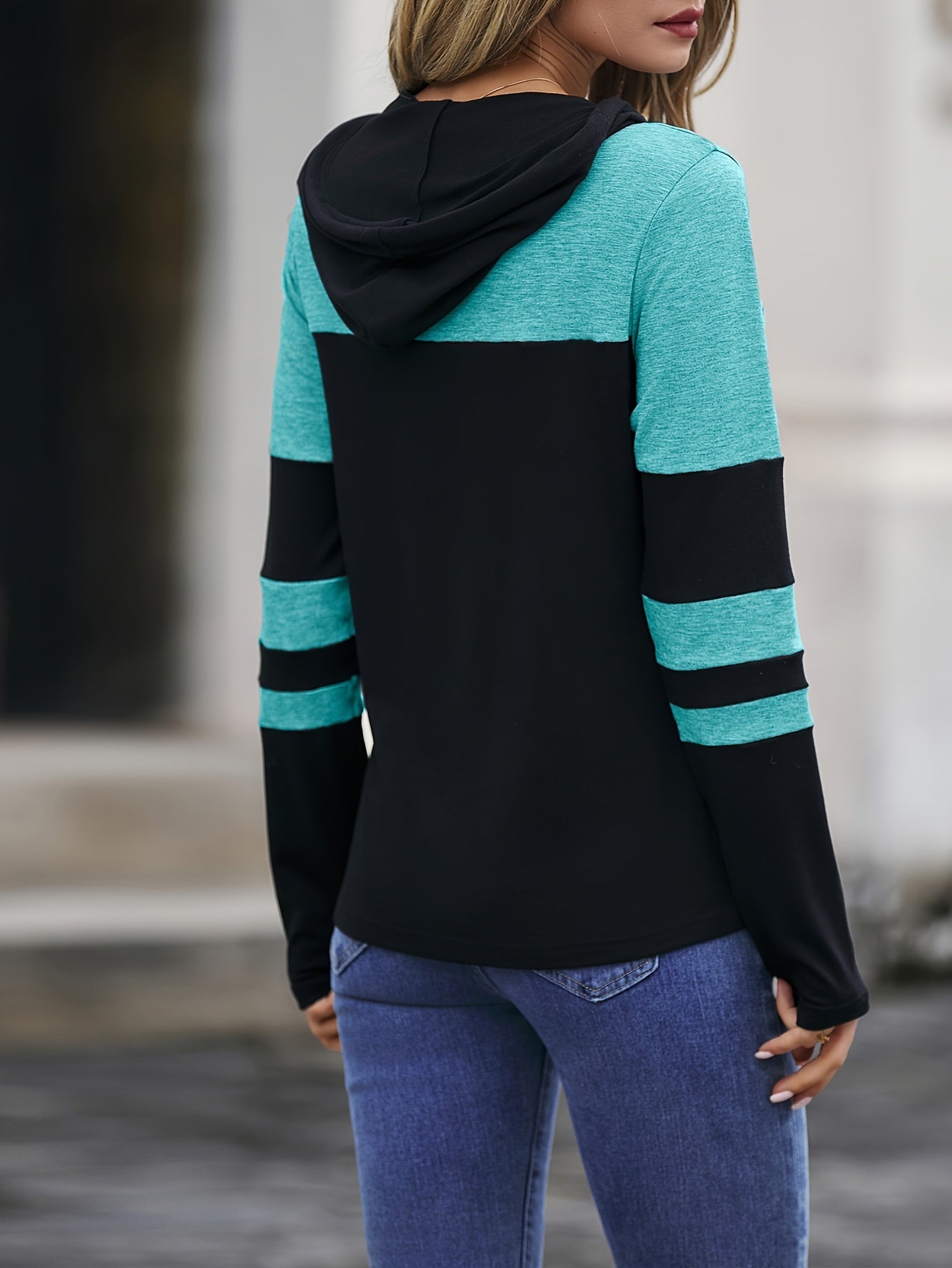 Colorblock Striped Hoodie, Casual Drawstring Long Sleeve Top For Spring & Fall, Women's Clothing