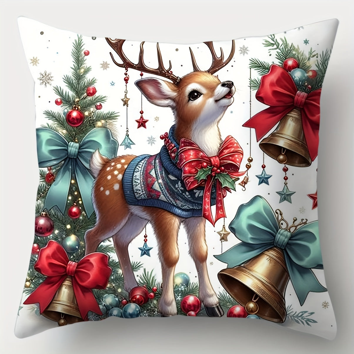 Contemporary Christmas Throw Pillow Covers Set of 4, Reindeer & Snowman, Teddy Bear & Christmas Bells, Decorative Cushion Cases, Zippered, Woven Polyester, Hand Wash, Home Sofa Decor 17x17 inches - Pillow Inserts Not Included