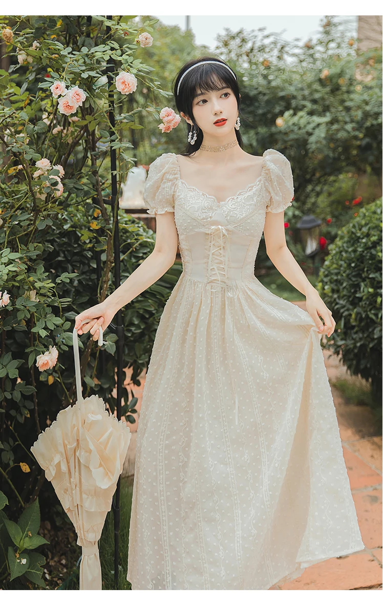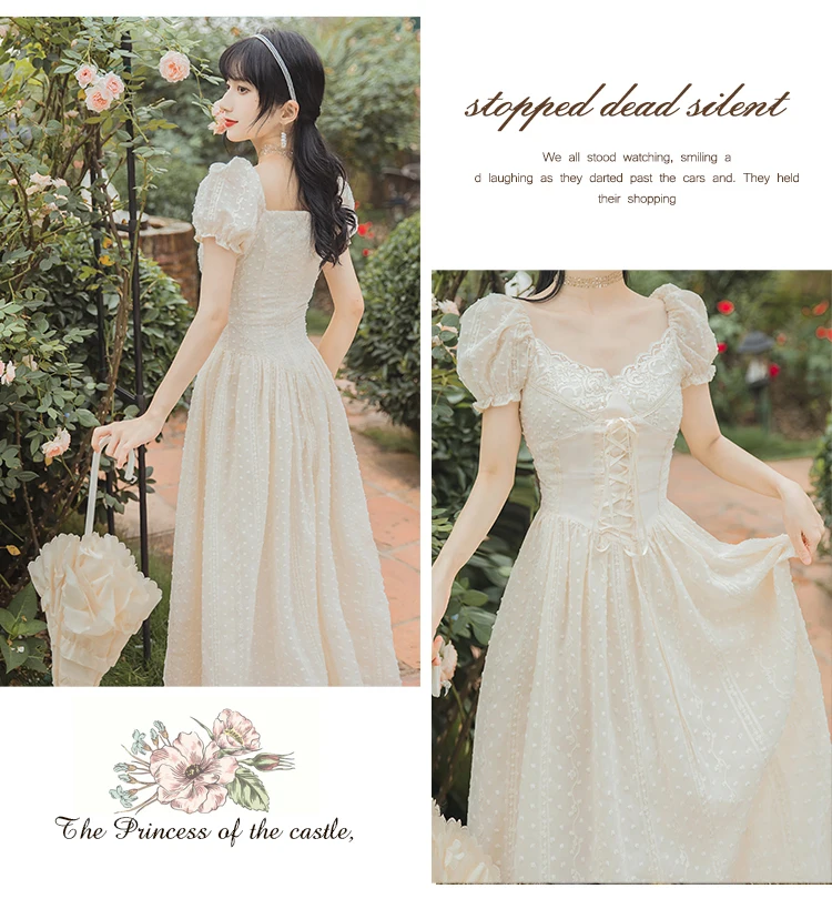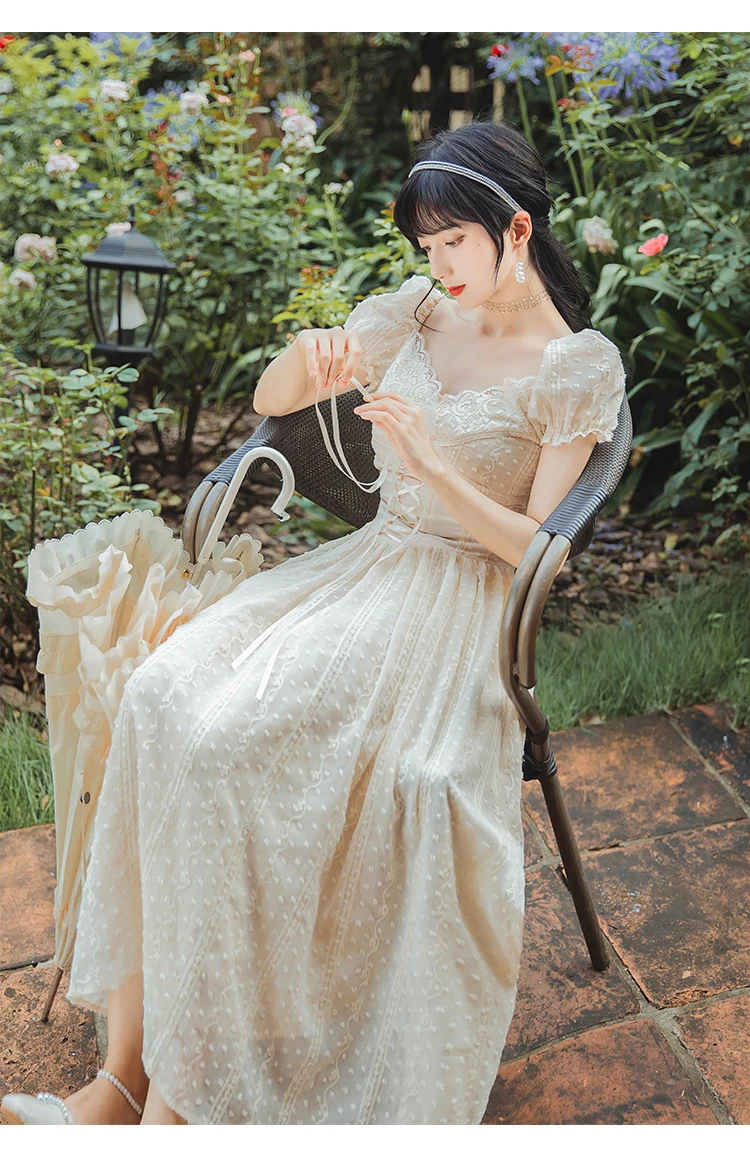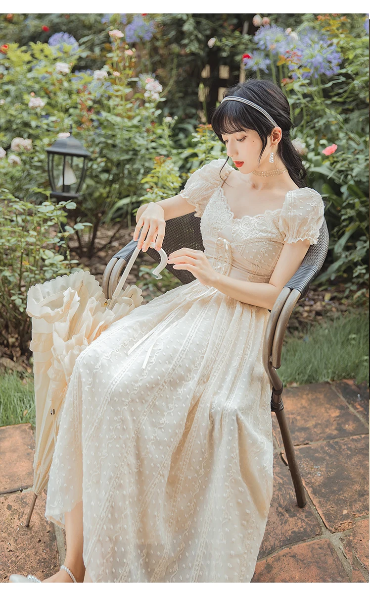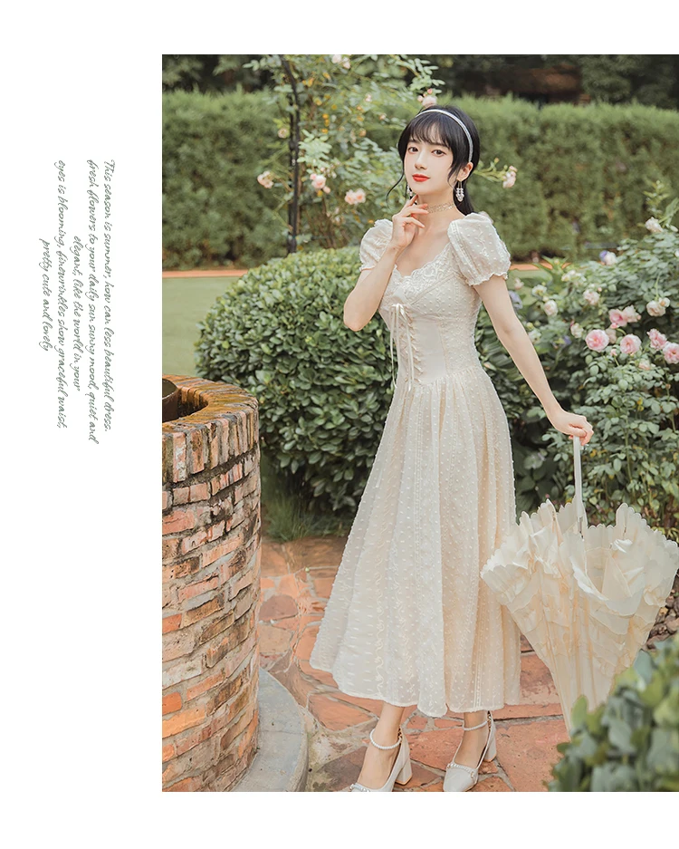 flowersverse Back to school outfit Cottage Vintage Woman Chiffon Dress For Slim Lady Summer Retro Puff Sleeve Bandage Royal Princess Dresses Vestido Festa