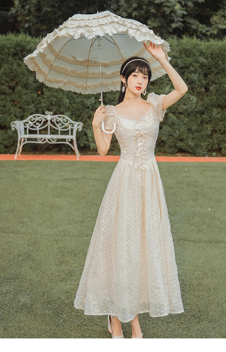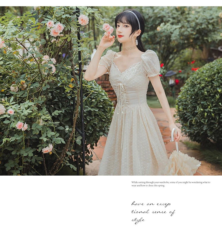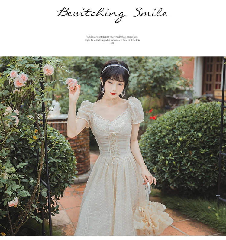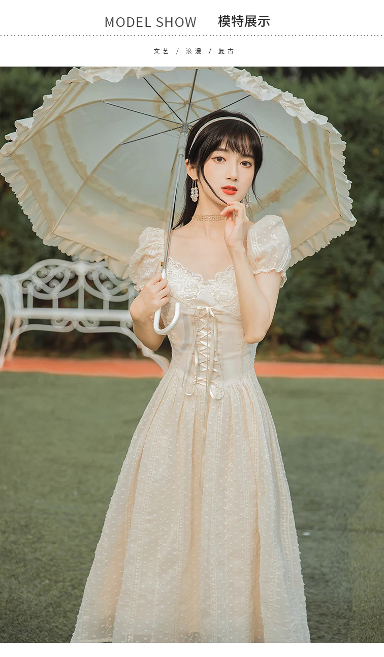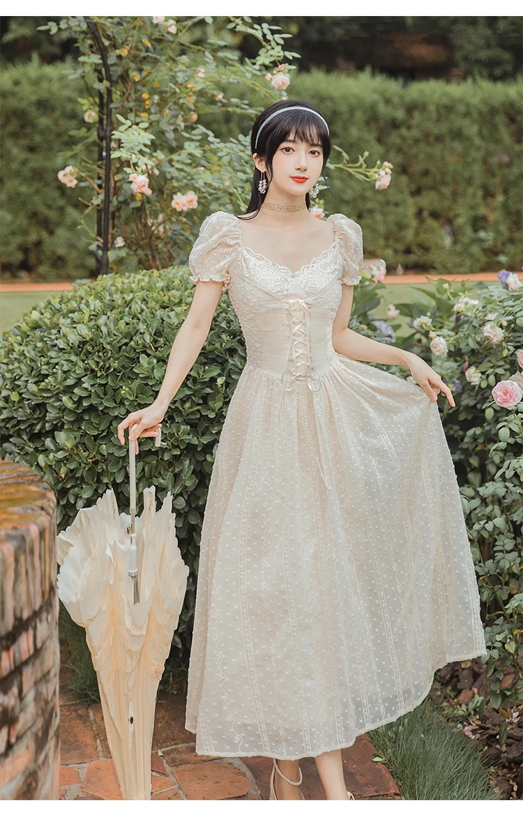 flowersverse Back to school outfit Cottage Vintage Woman Chiffon Dress For Slim Lady Summer Retro Puff Sleeve Bandage Royal Princess Dresses Vestido Festa