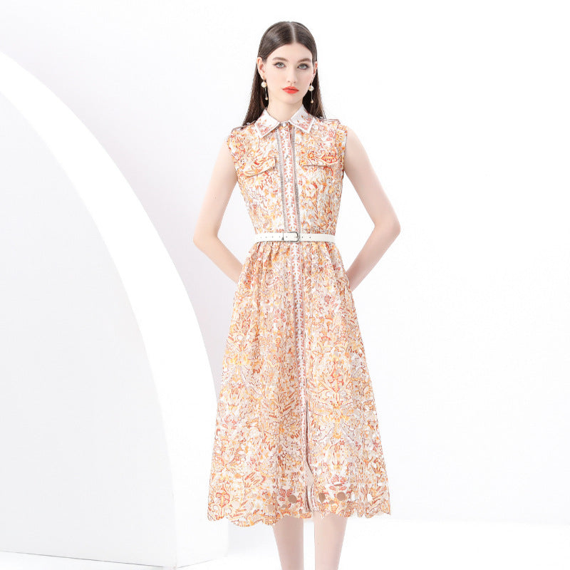 court style deep V-neck small flying sleeves waist thin single-breasted printing split-ended ruffle edge holiday dress