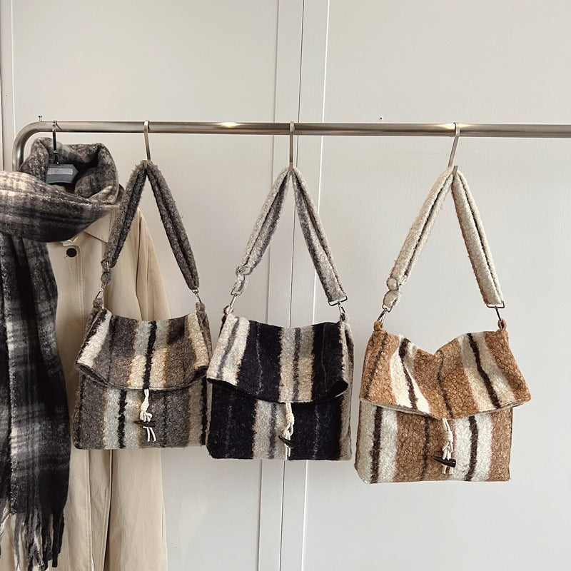 FLOWERSVERSE 2025 popular autumn and winter new striped woolen shoulder bag fashion lamb wool folding horn buckle Korean version fashion messenger bag