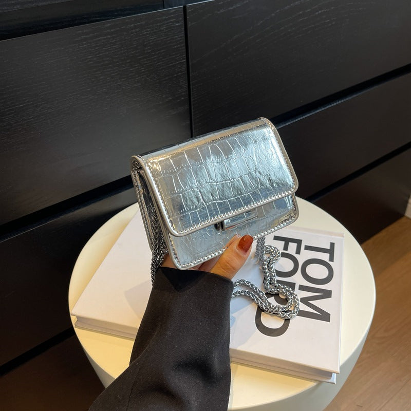 FLOWERSVERSE 2025 Small bag women's new silver glossy mini square bag crocodile pattern embossed chain messenger bag air cushion mouth red envelope