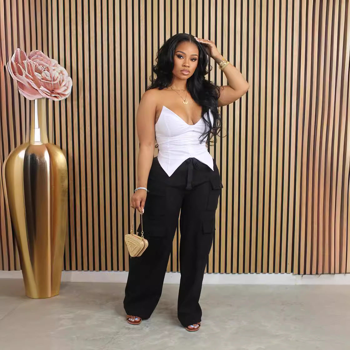 FLOWERSVERSE D88228 European and American Women's Clothing Hot Sale Corduroy Multi-Pocket Drawstring Elastic Waist Straight Cargo Pants