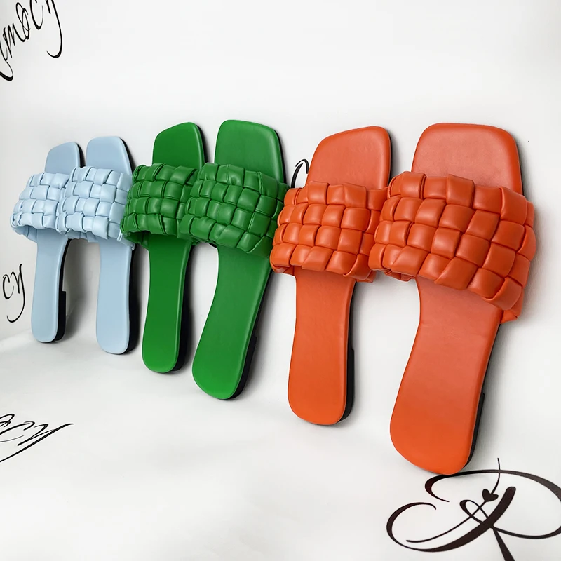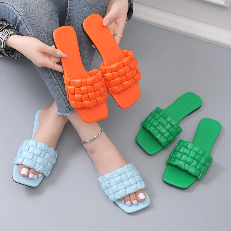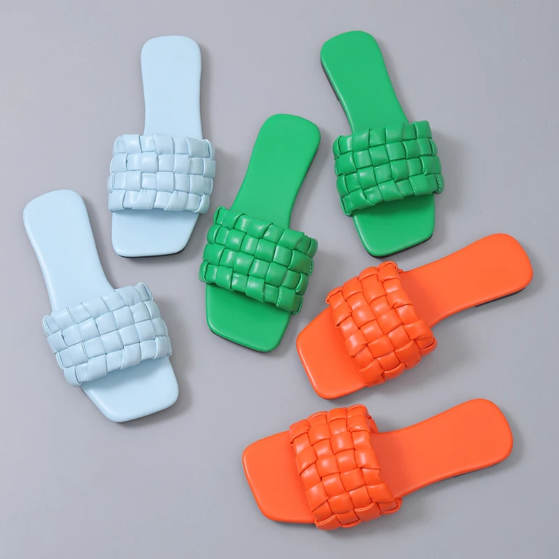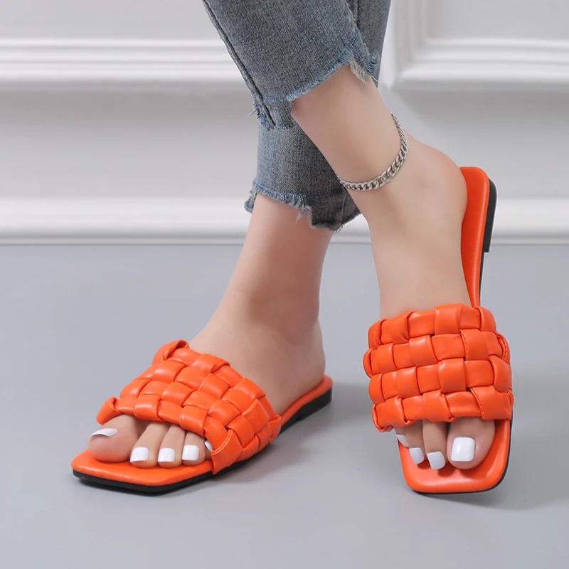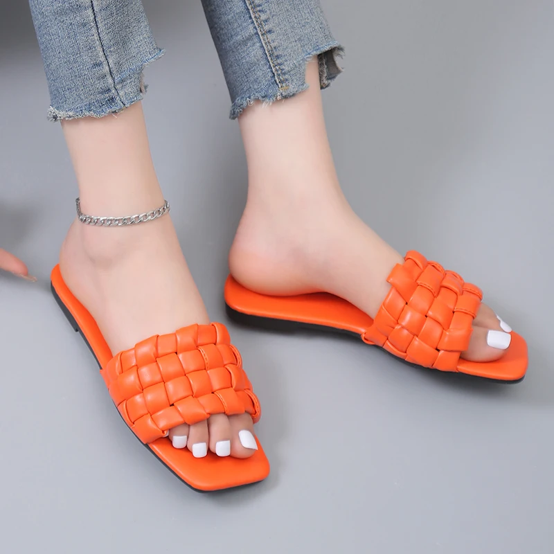 flowersverse Design Weave Soft Slippers for Women Summer Orange PU Leather Beach Flip Flops Female Square Toe Flat Sandals Plus Size 43