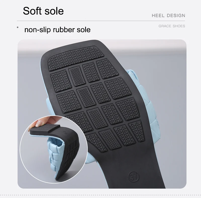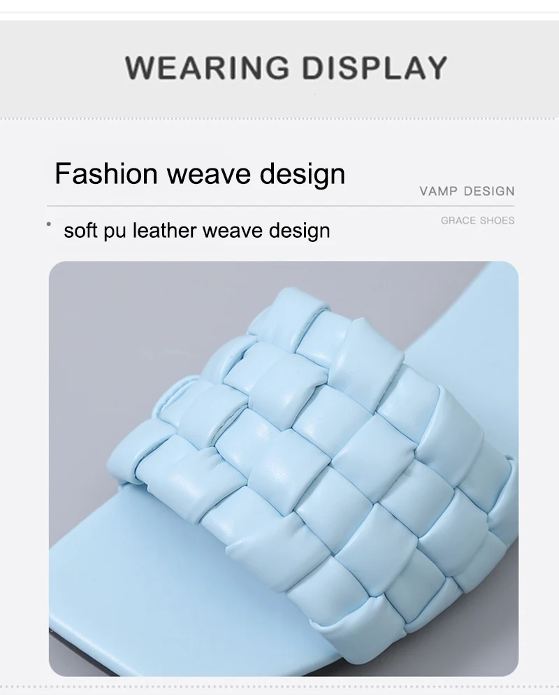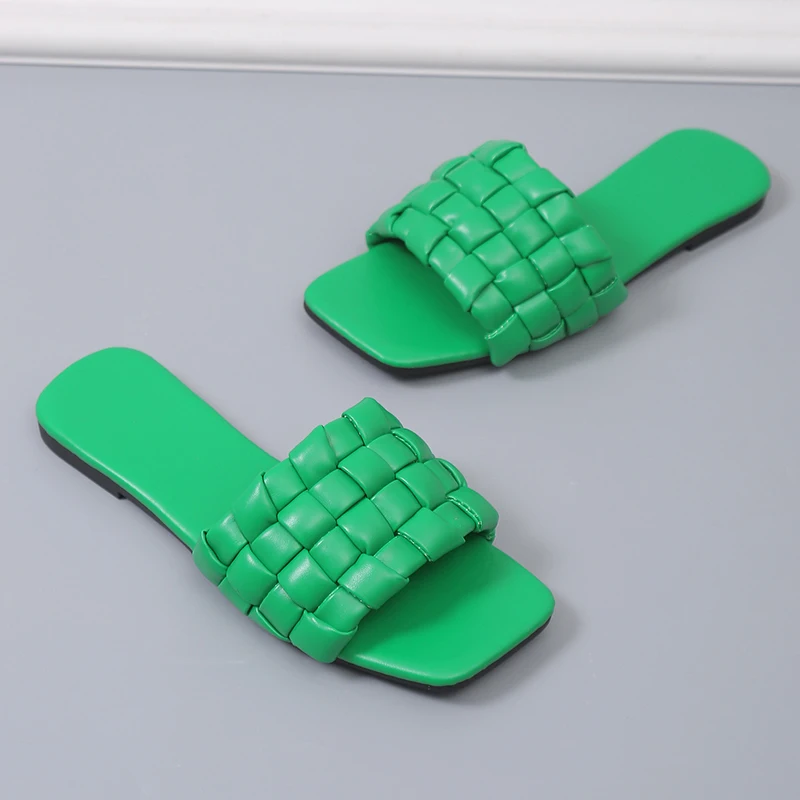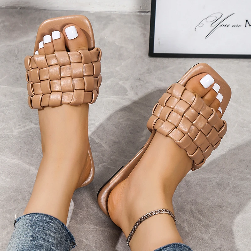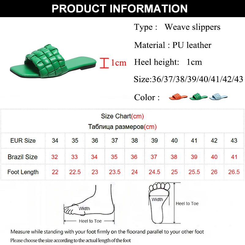 flowersverse Design Weave Soft Slippers for Women Summer Orange PU Leather Beach Flip Flops Female Square Toe Flat Sandals Plus Size 43