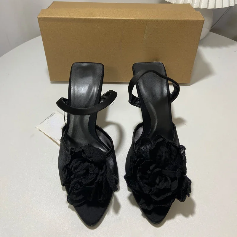flowersverse-Flowers Slingback High Heels Women Pointed Fine Heel Sandals Women Open-toe Black Mesh Floral Party Dress Slippers Women Pumps