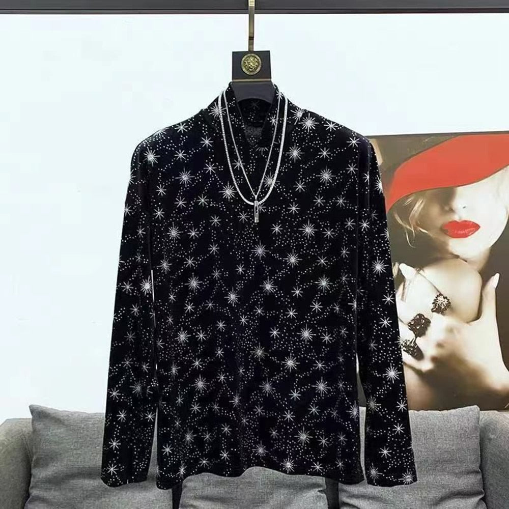flowersverse Men Casual T Shirt Printed Velour Turtleneck Streetwear Long Sleeve Undershirts Cozy Leisure Men Clothing EU XS-XL