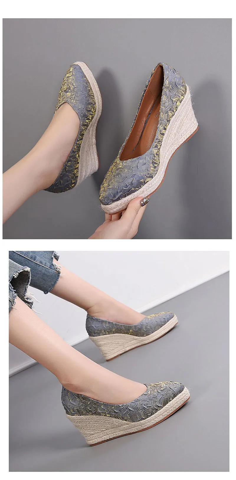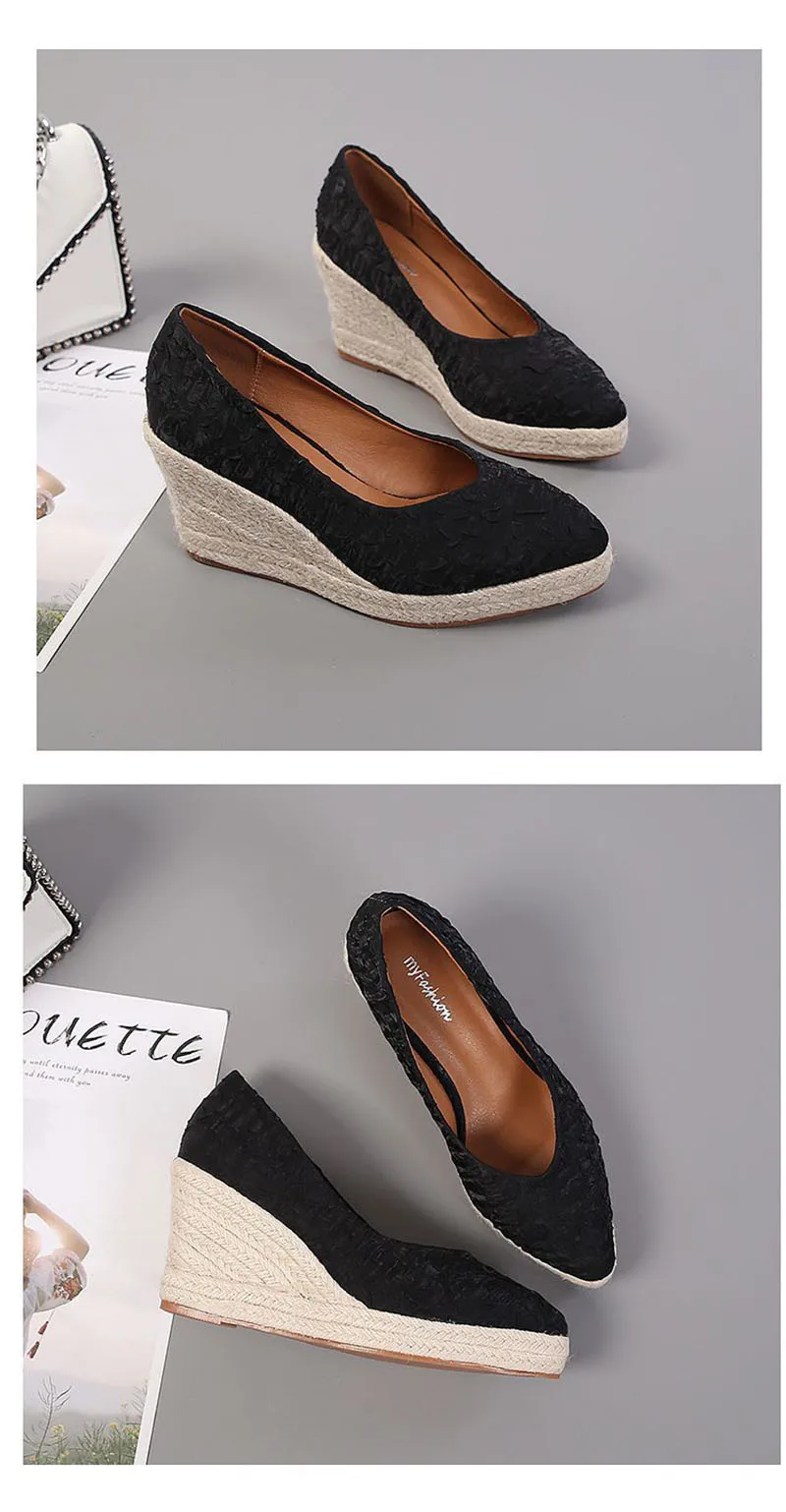 flowersverse-New Pointed Shallow Mouth Women Wedge Heel Thick Sole Single Shoes Women Straw Woven Twine rope sole Spring Autumn Shoes