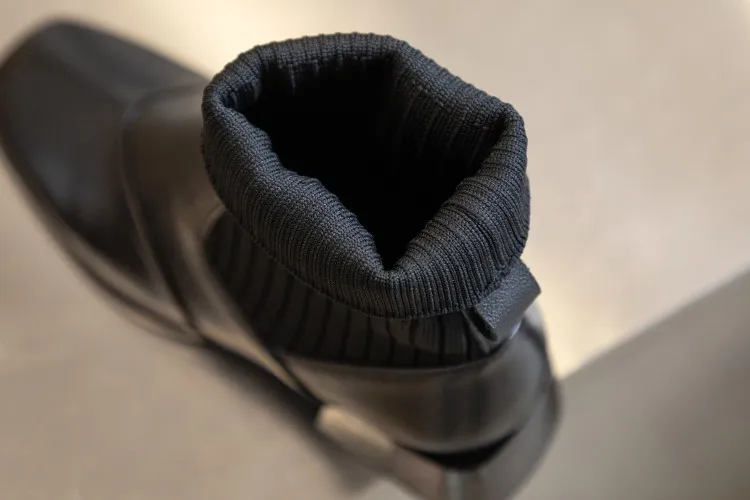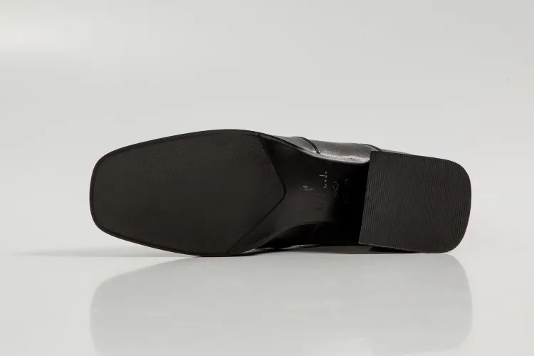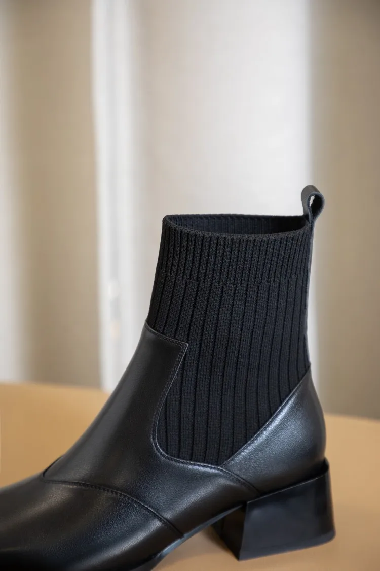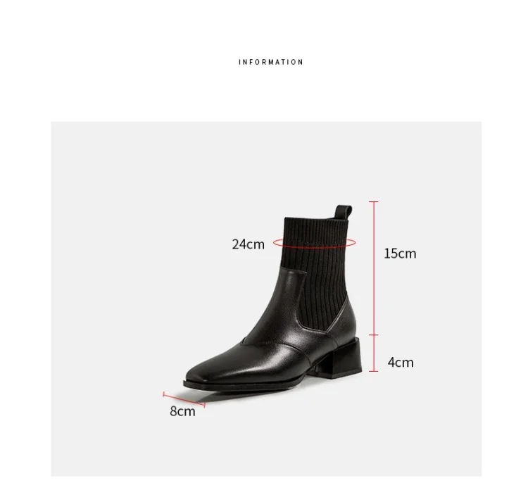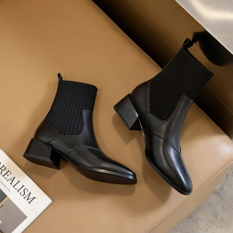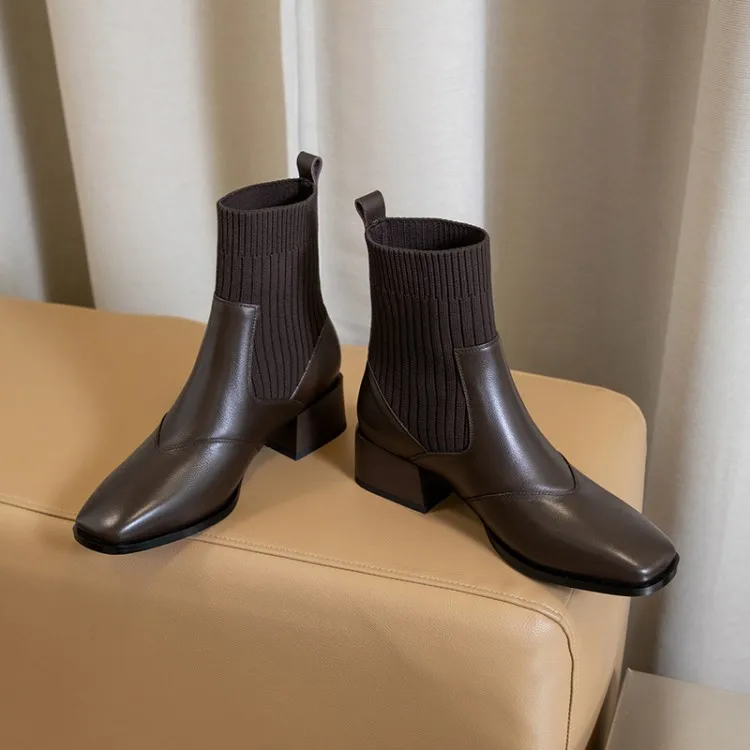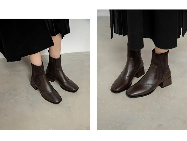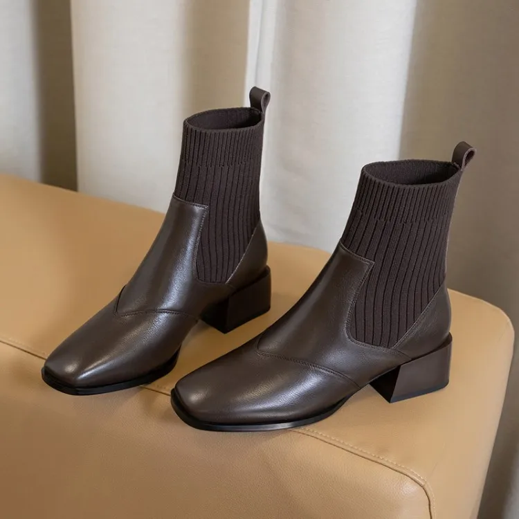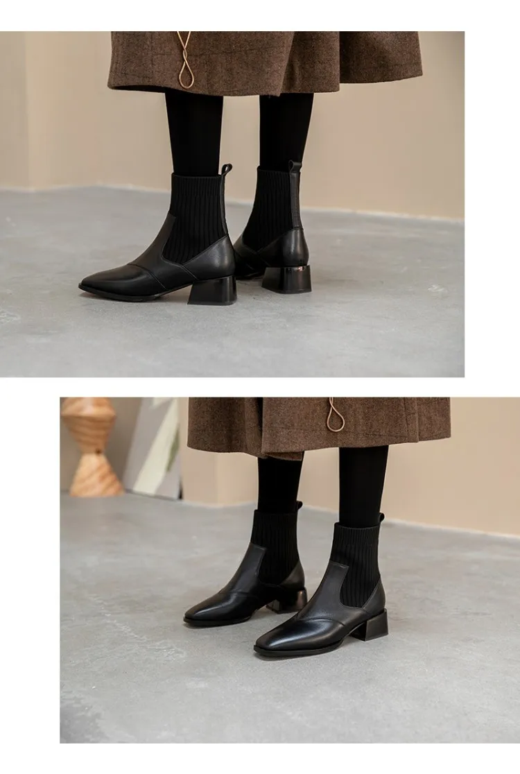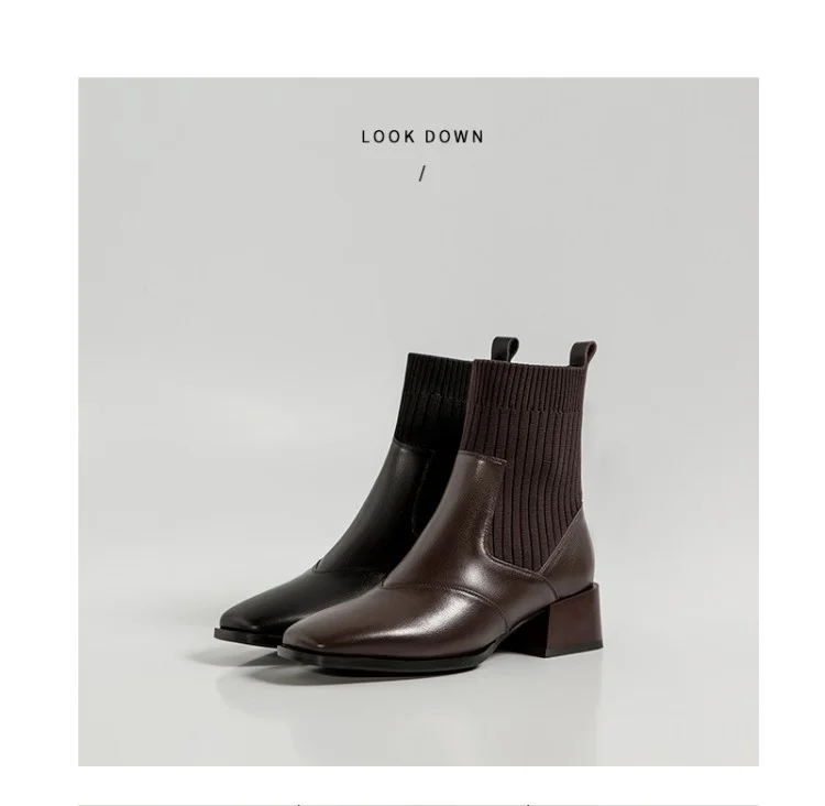 flowersverse New Spring/Autumn Women Boots Solid Square Toe Low-Heel Genuine Leather Women's Shoes Comfortable Square Heel Boots for Women