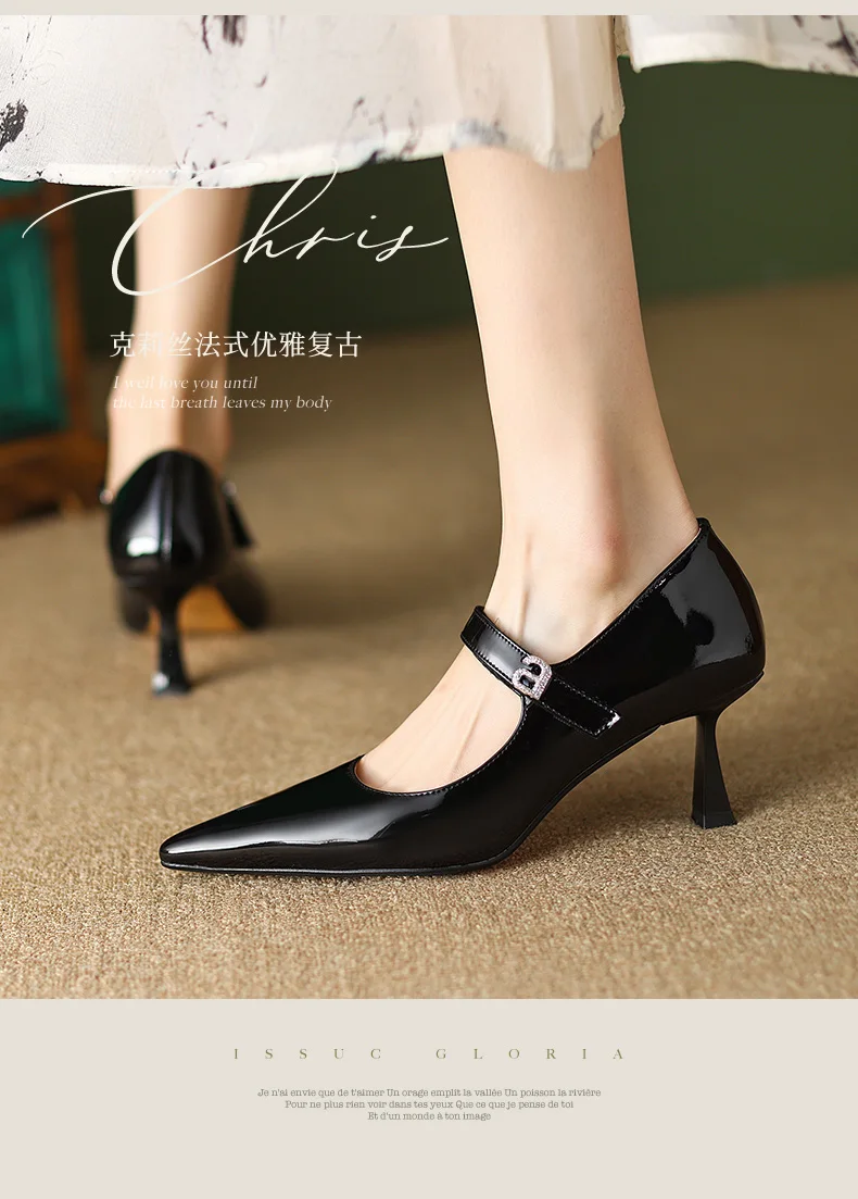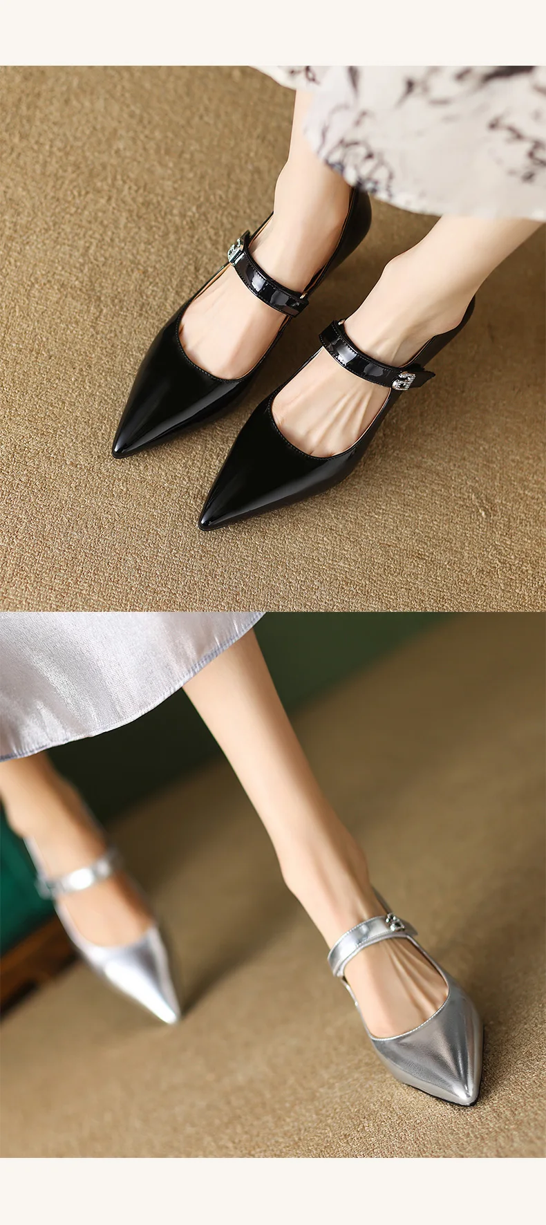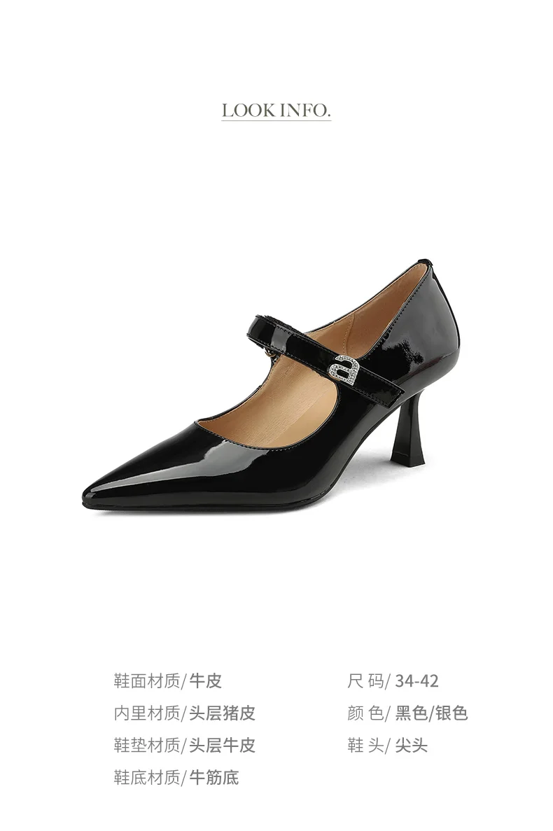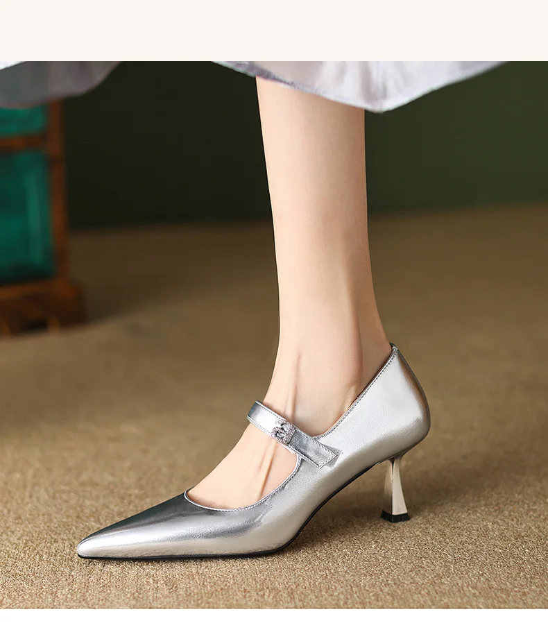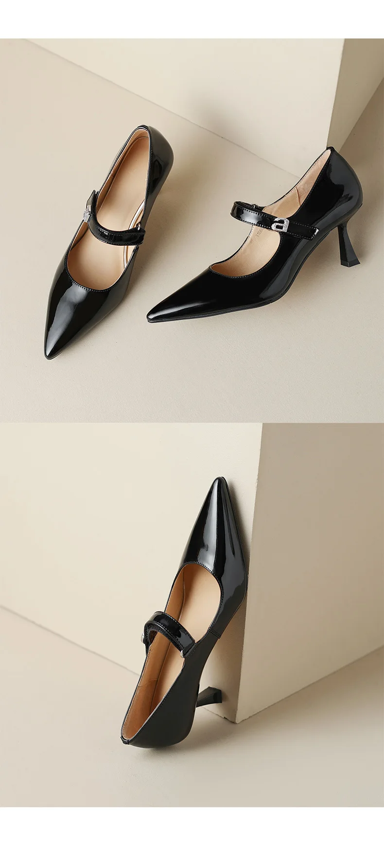 flowersverse Spring women pumps natural leather plus size22-26cm cowhide+pigskin full leather pointed toe buckle Mary Jane shoes high heels