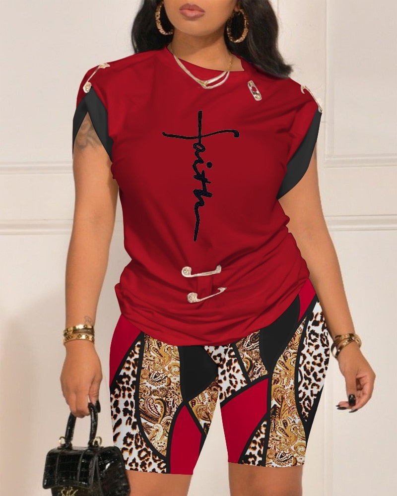 Two Piece Sets Womens Outifits Summer Fashion Design Pin Digital Print Round Neck Short Sleeved Top & Casual Skinny Shorts Set
