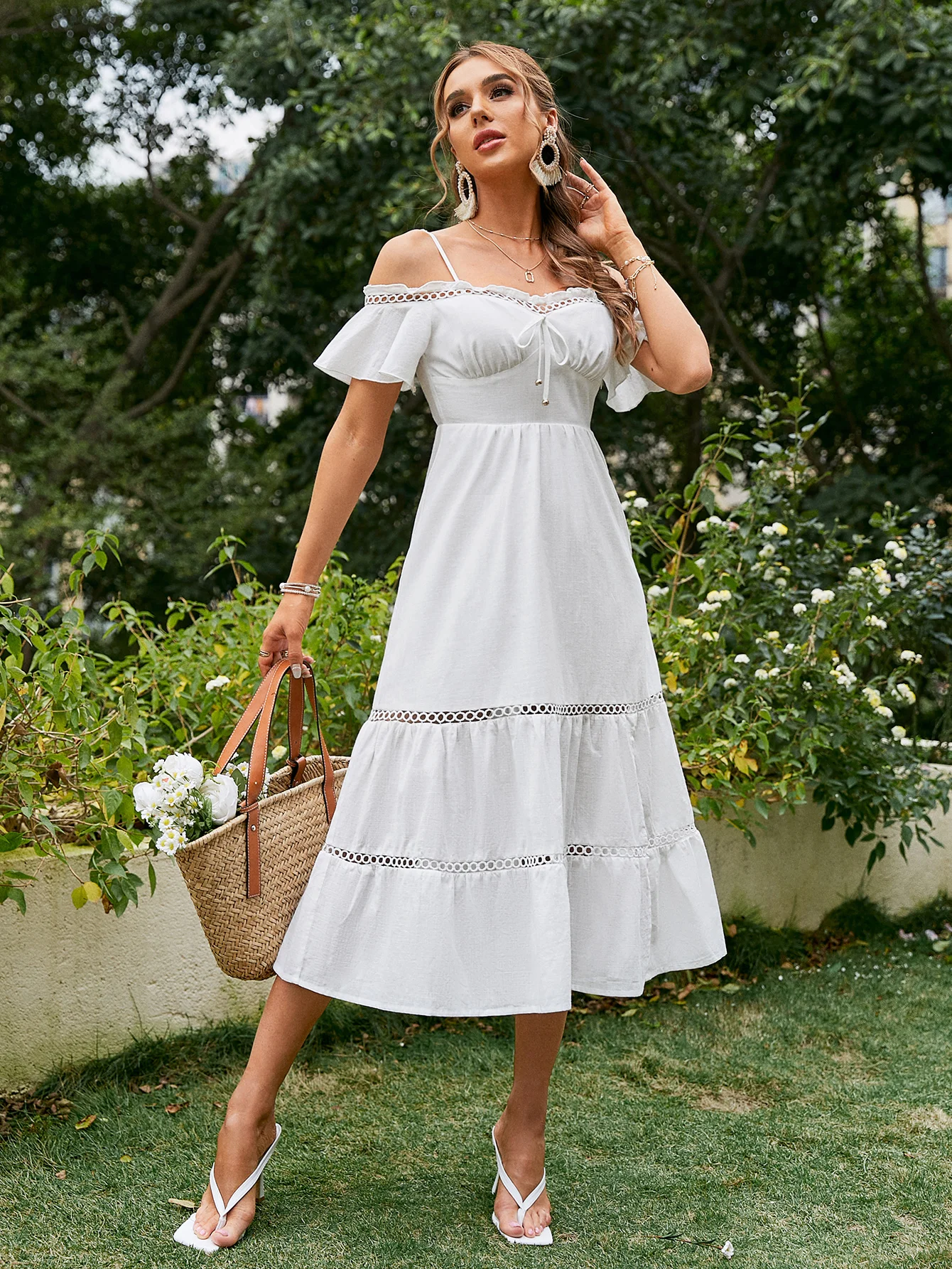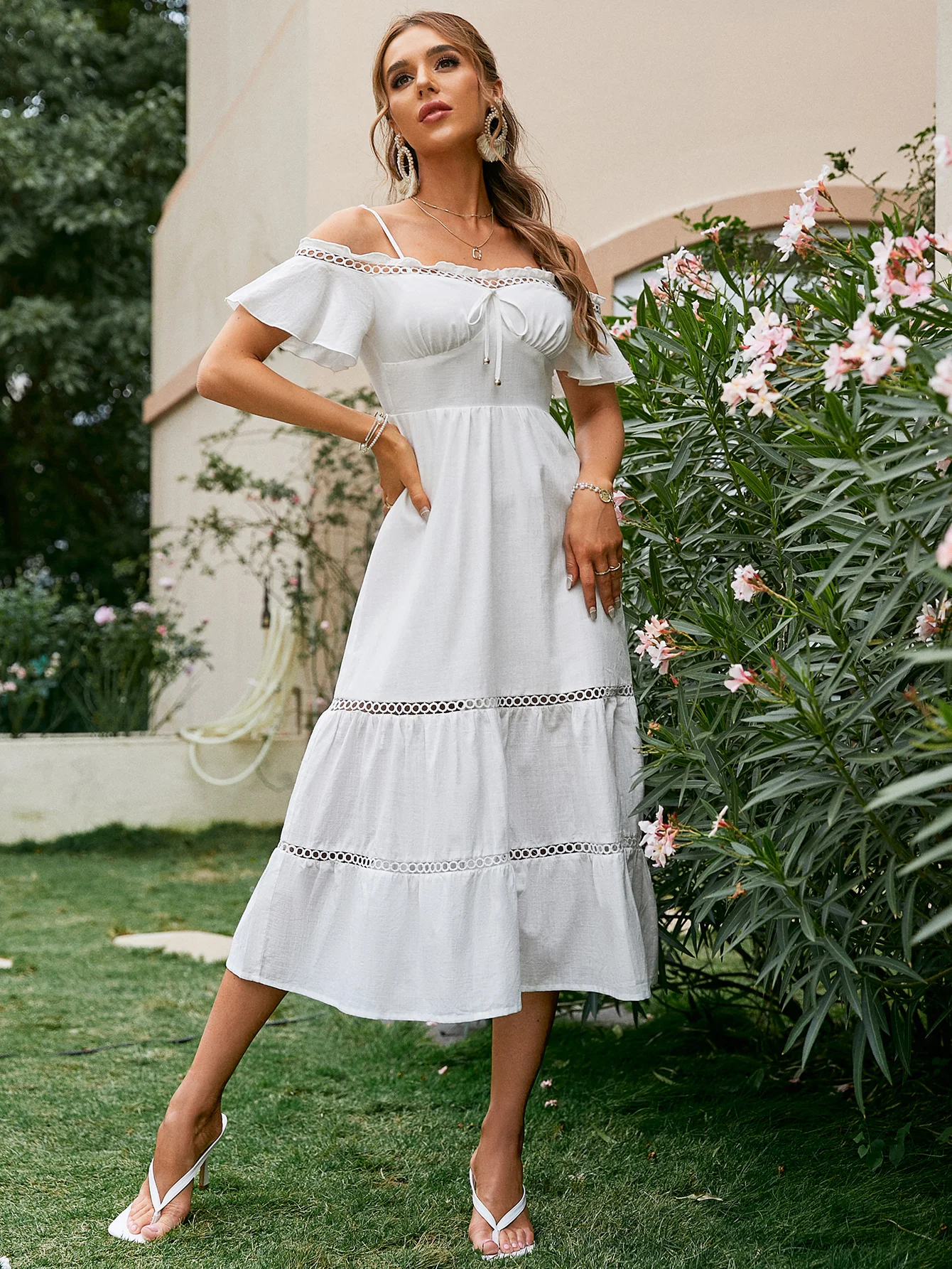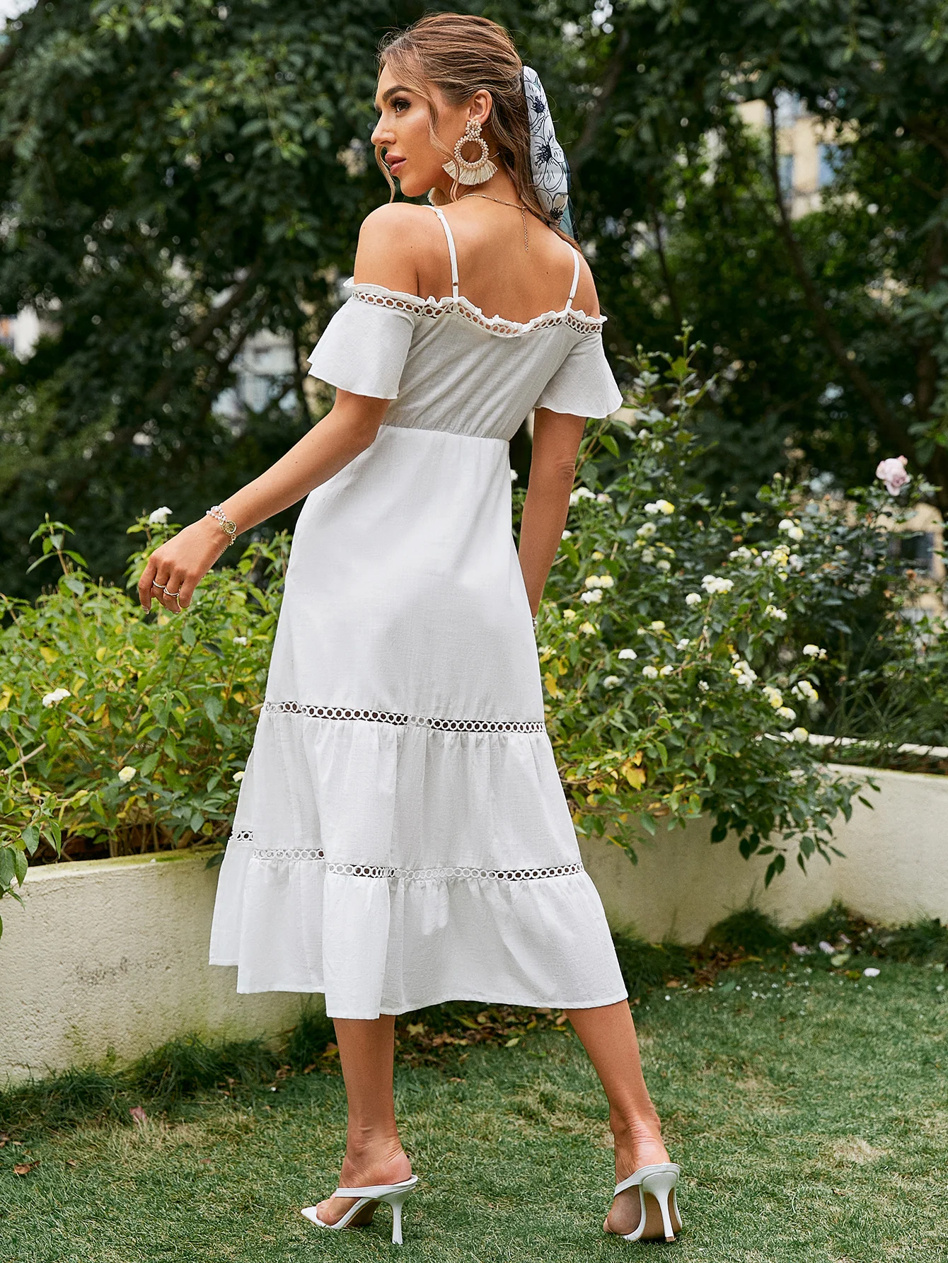Graduation Gift Big Sale Elegant cold shoulder ruffle white summer dress women Cut out lace cotton maxi dresses A-line split holiday vestido