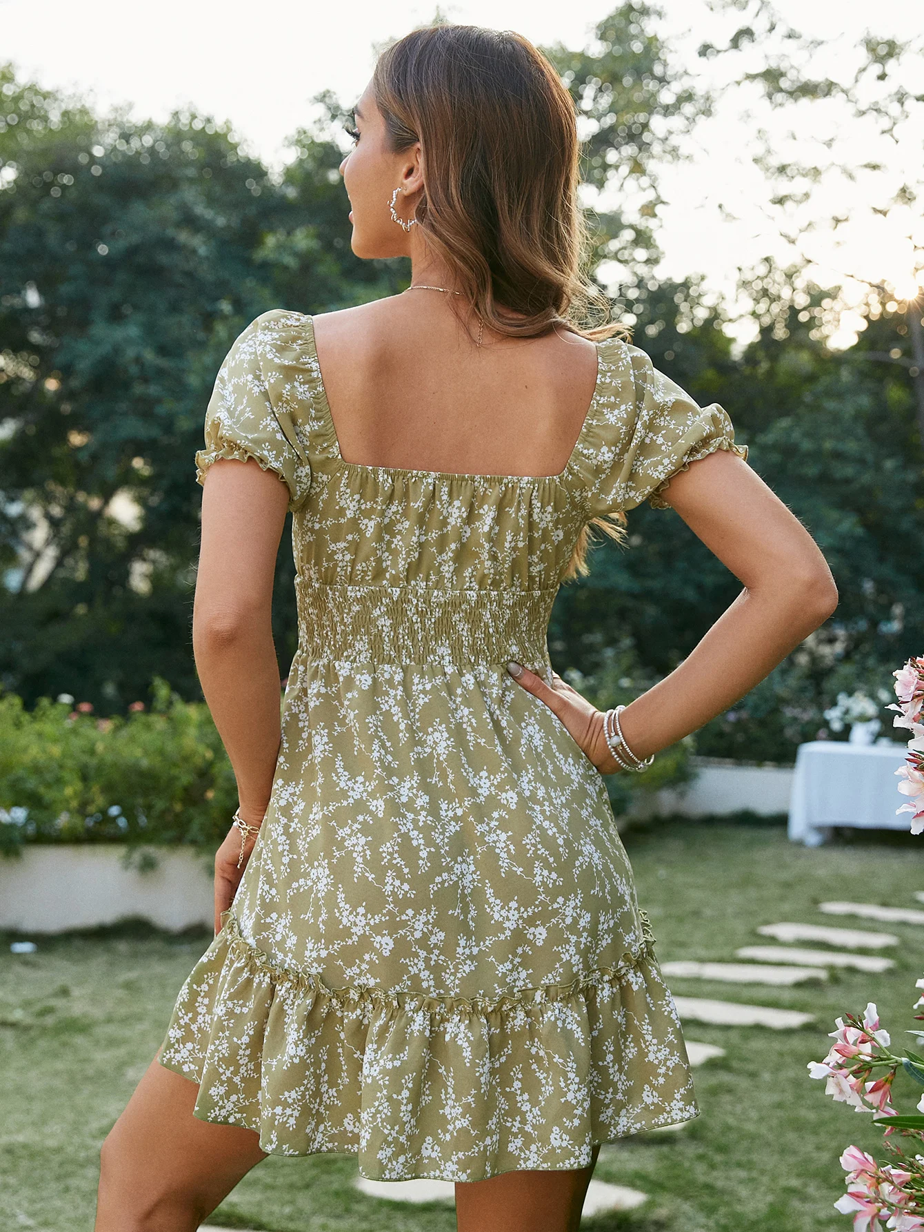 Graduation Gift Big Sale Holiday short sleeves green print summer dress women Square collar ruffle mini dresses Elastic high waist A-line vestido
