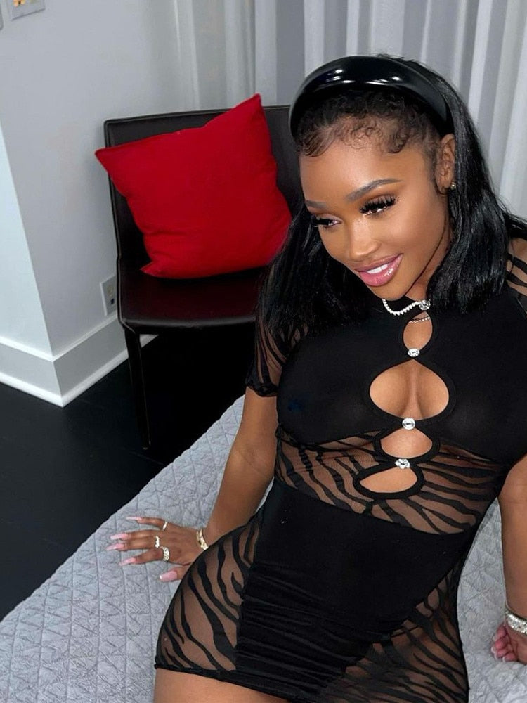 flowersverse Hirigin Cut Out Zebra Mesh Transparent Women's Mini Dress For Beach Holiday Night Club Party Bodycon Pencil Short Dresses