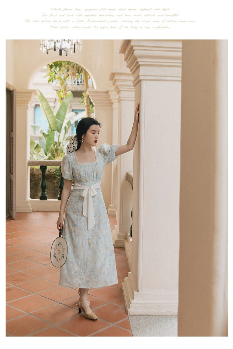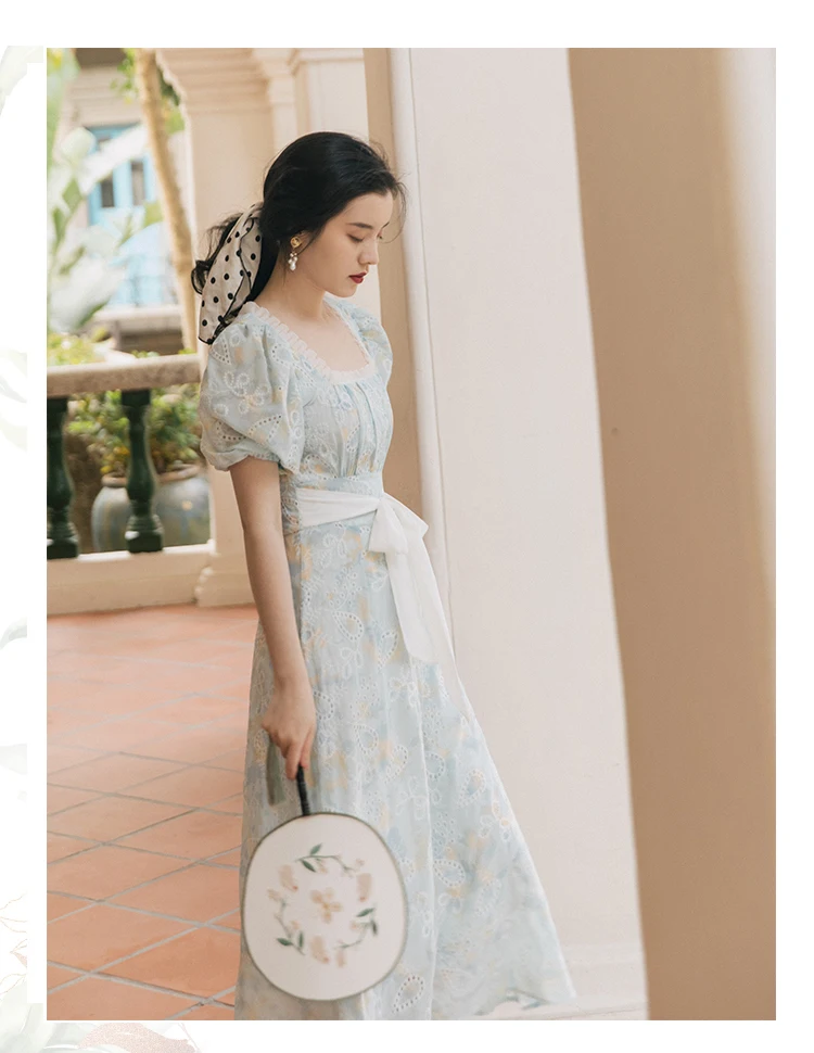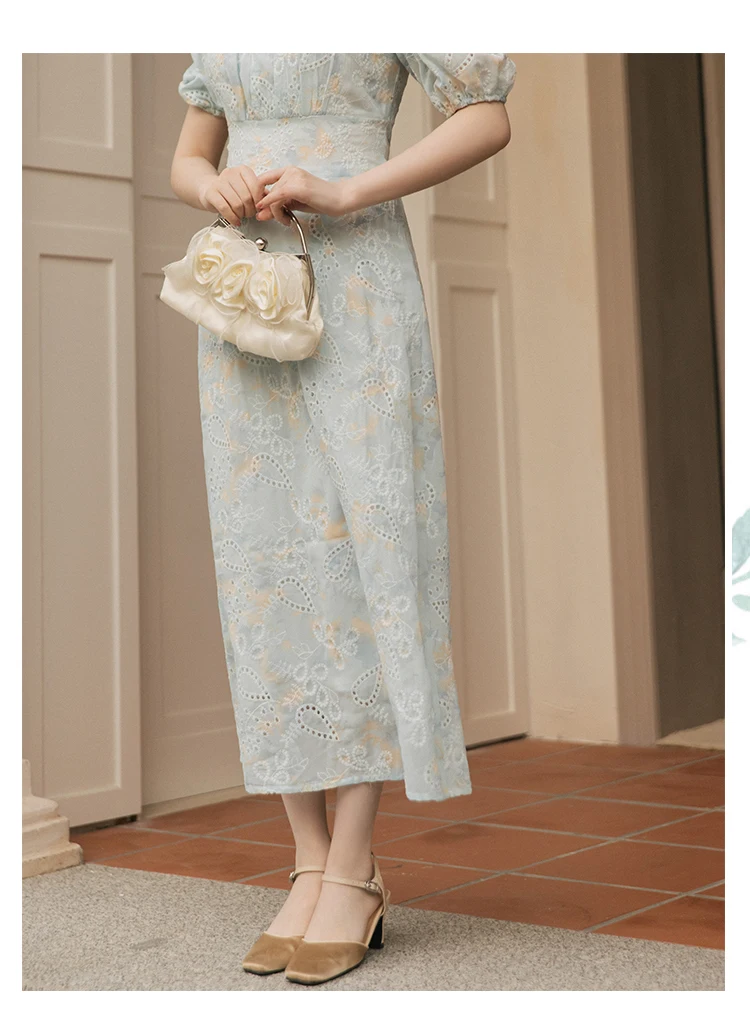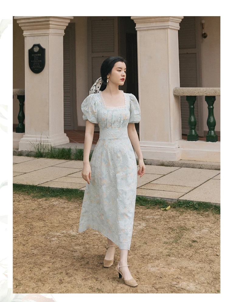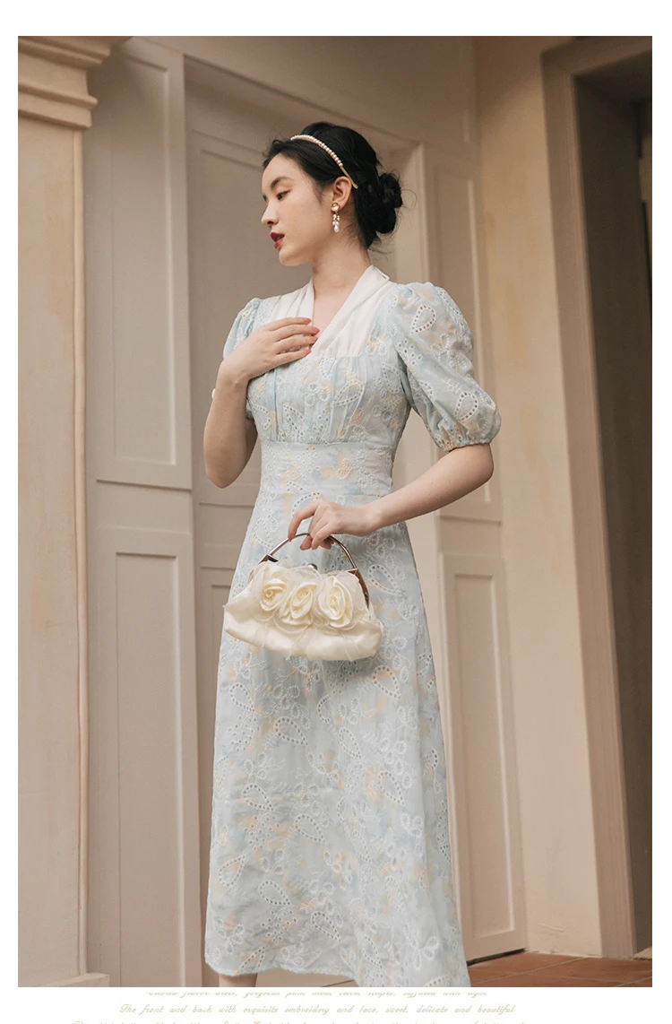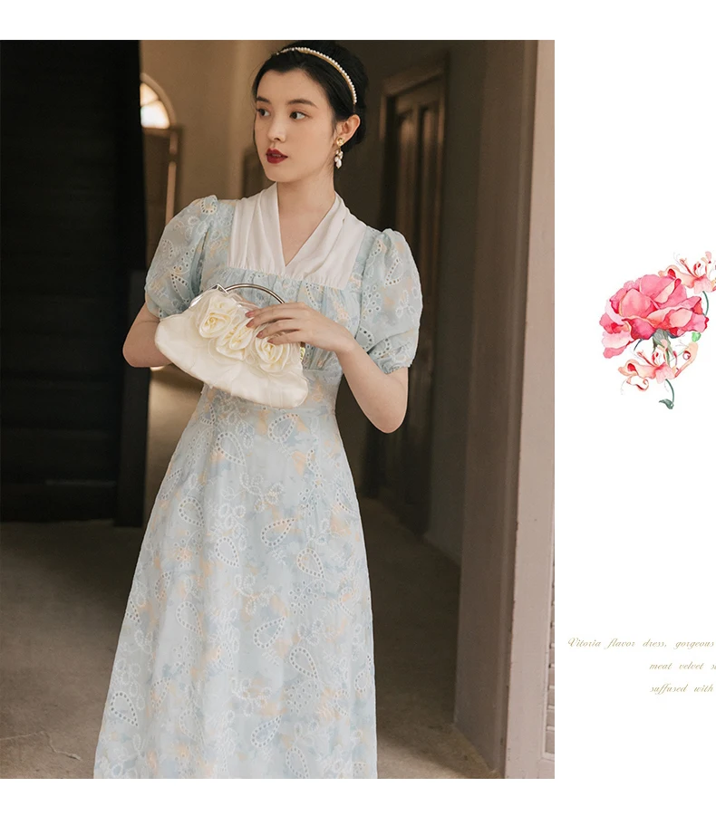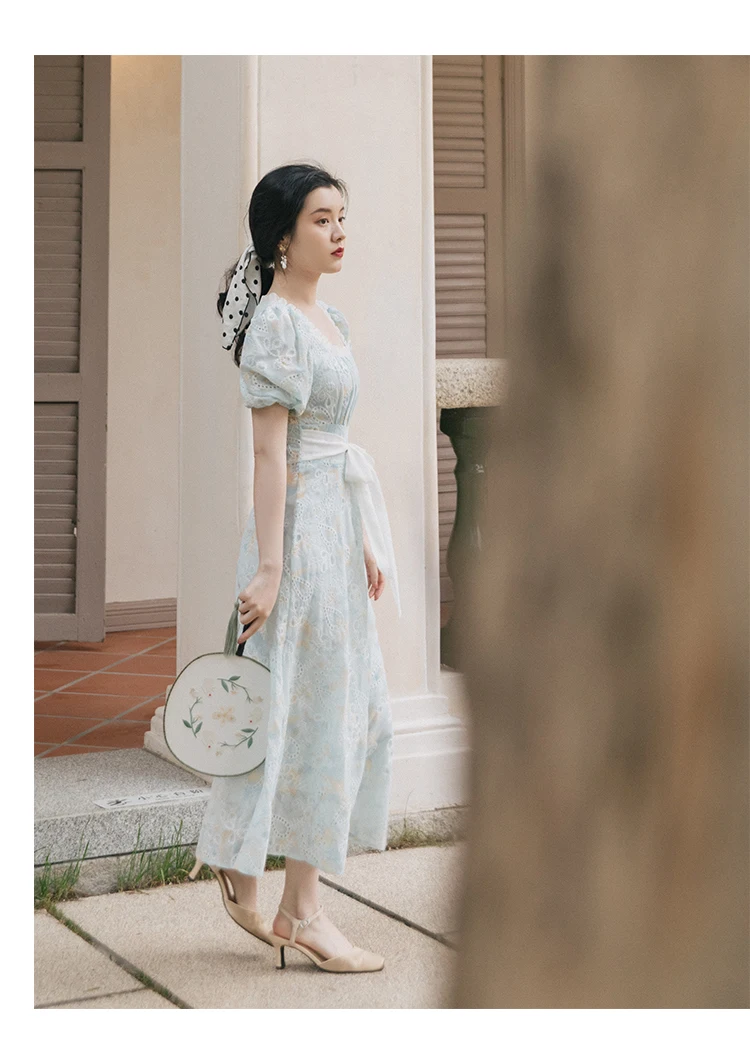 flowersverse Back to school Korean Design Women Long Dress Summer Vintage Light Blue Hollow Out Puff Sleeve Elegant Midi Dresses Gorgeous Vestido Festa