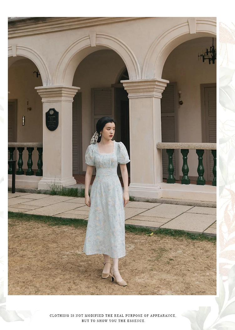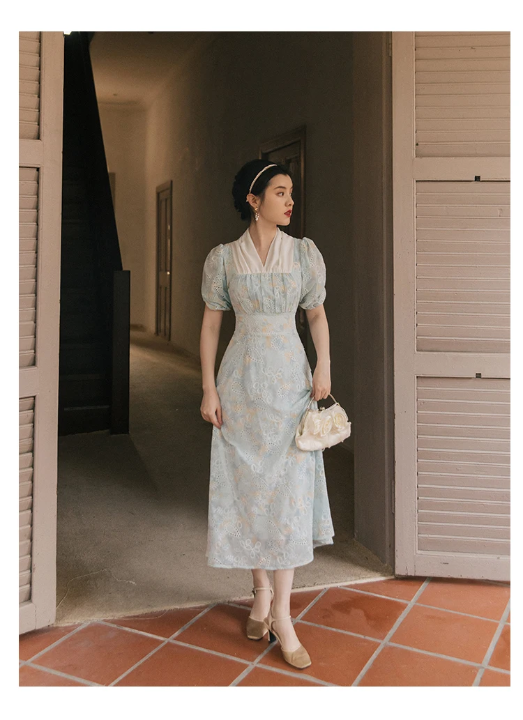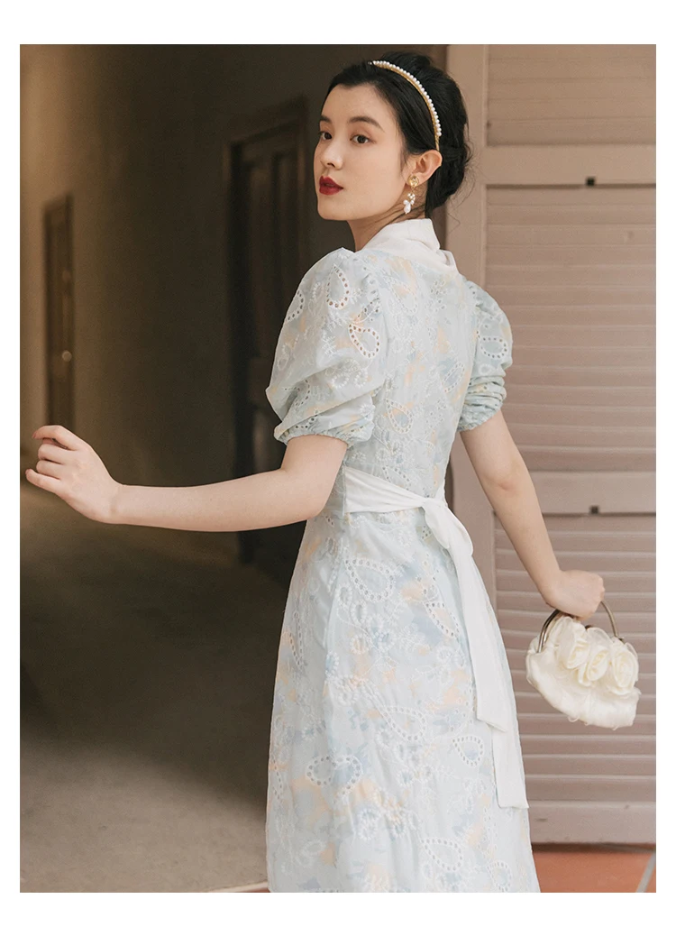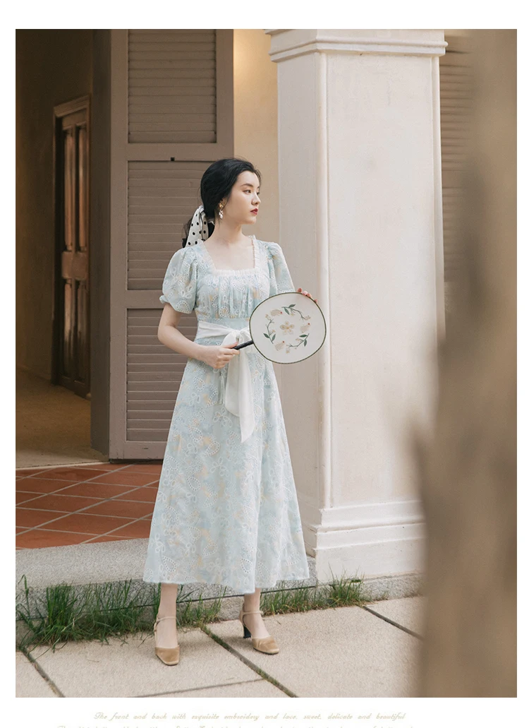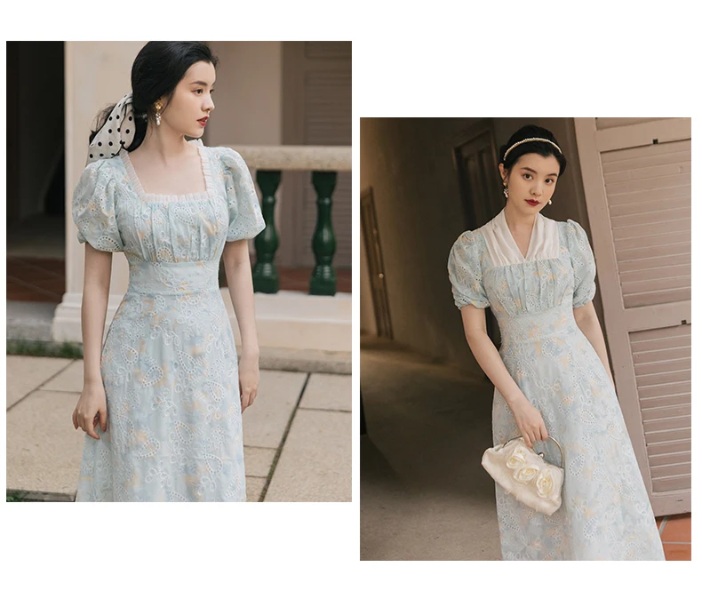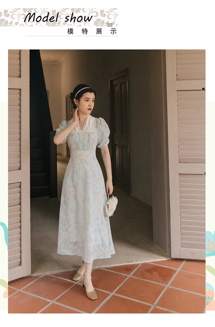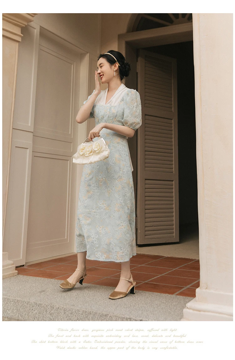 flowersverse Back to school Korean Design Women Long Dress Summer Vintage Light Blue Hollow Out Puff Sleeve Elegant Midi Dresses Gorgeous Vestido Festa