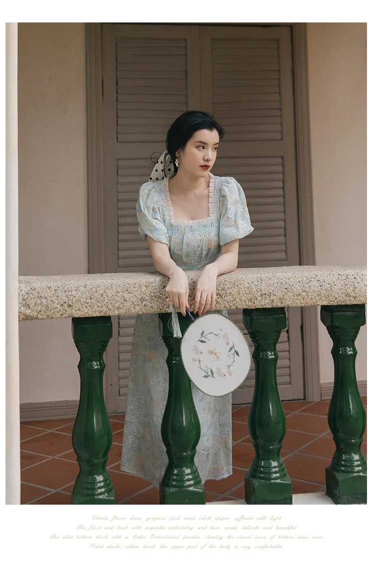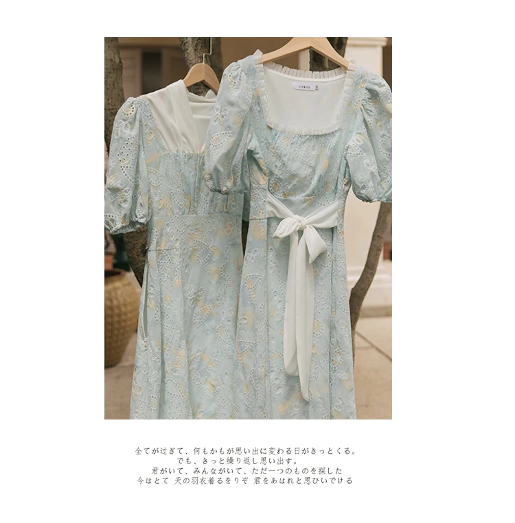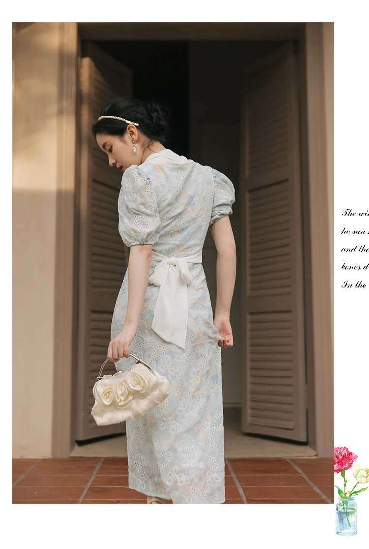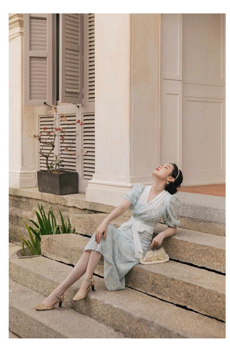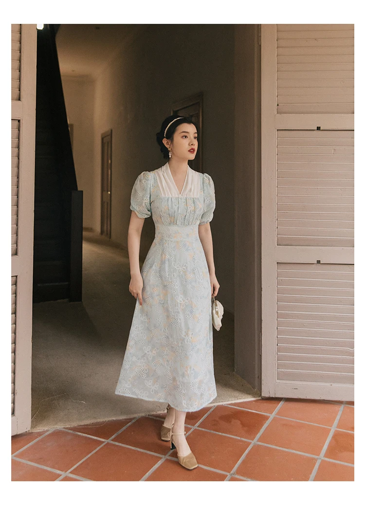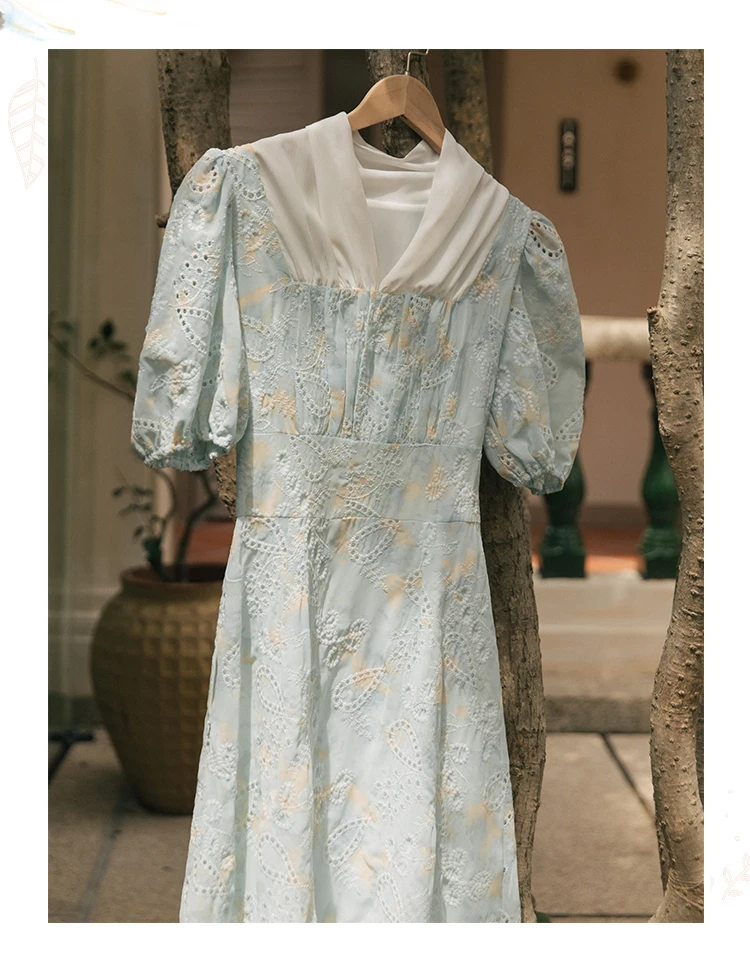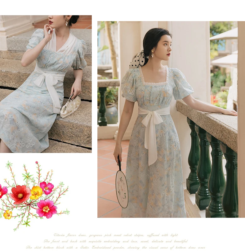 flowersverse Back to school Korean Design Women Long Dress Summer Vintage Light Blue Hollow Out Puff Sleeve Elegant Midi Dresses Gorgeous Vestido Festa