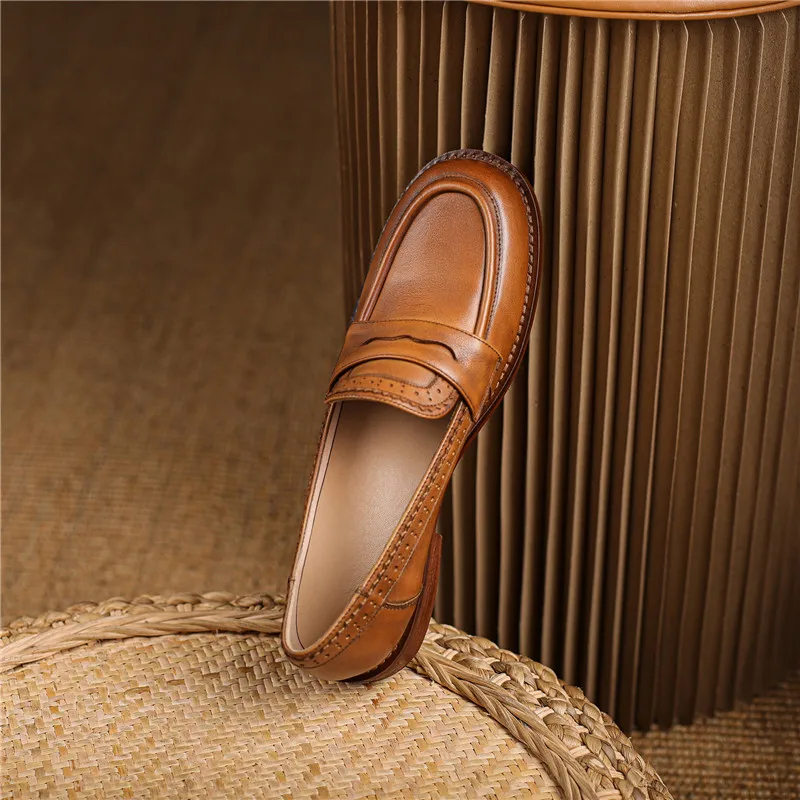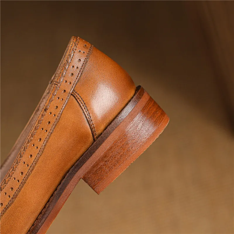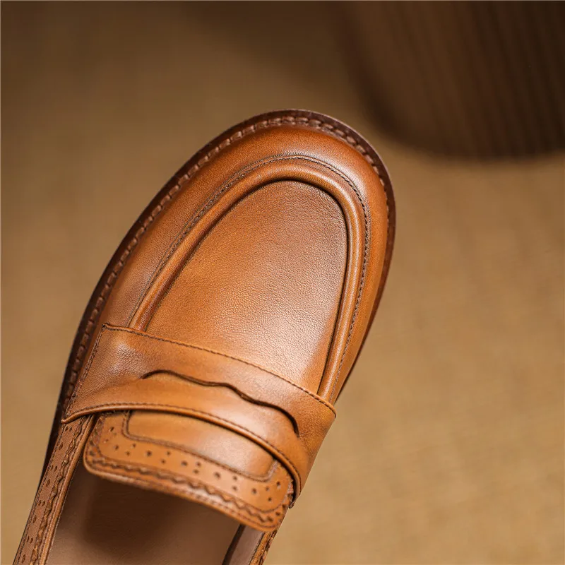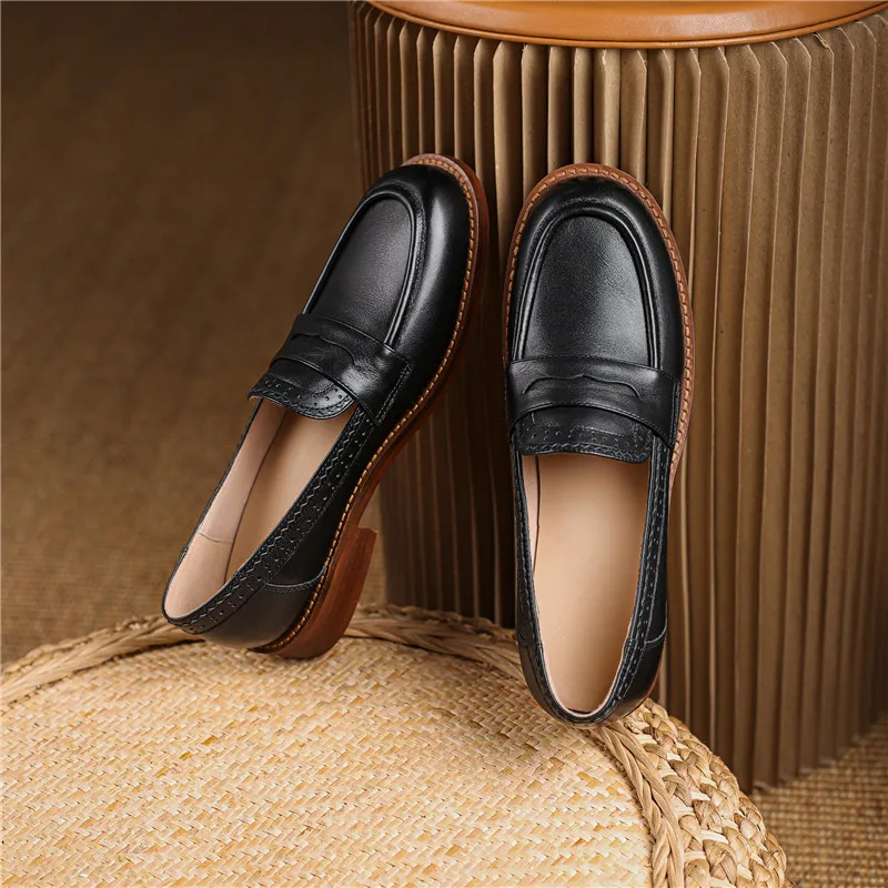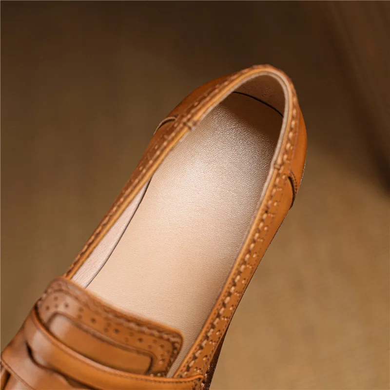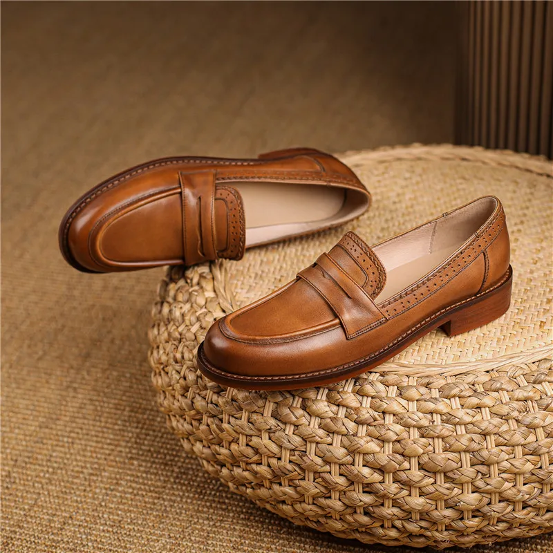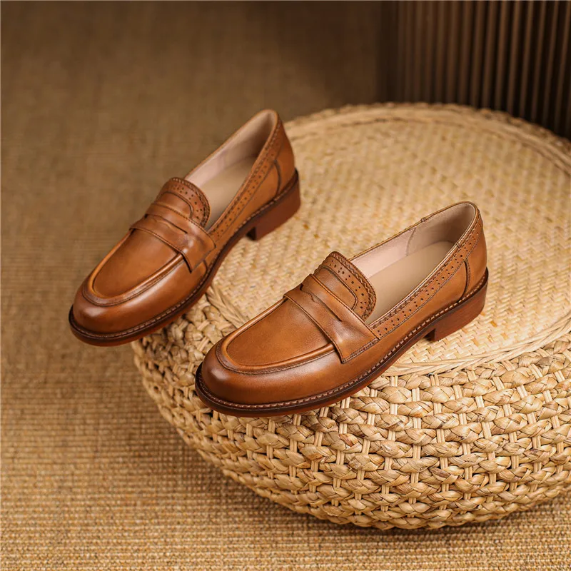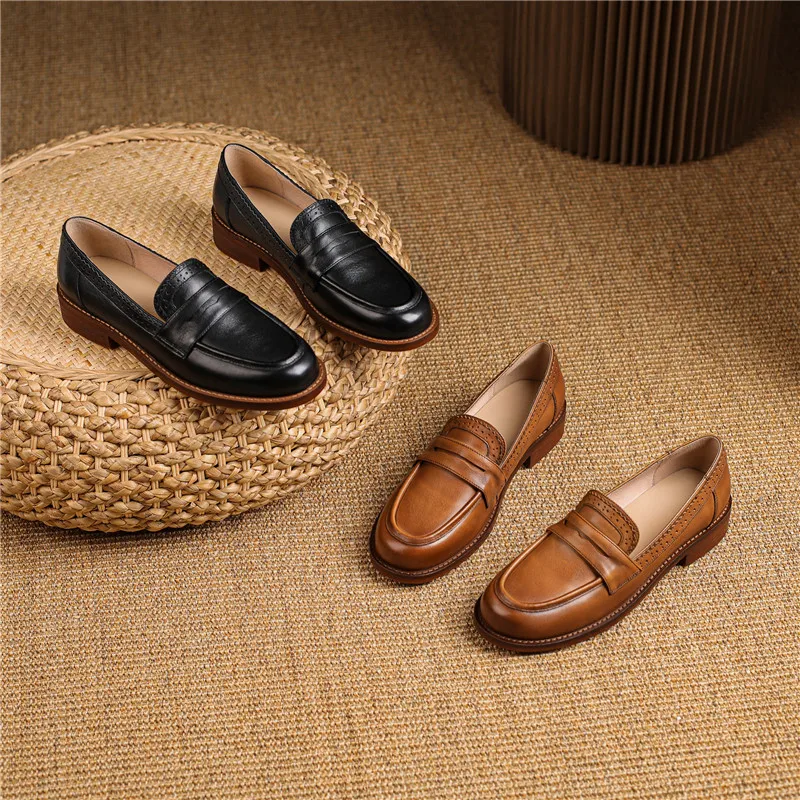 Amozae New 2023 Genuine Leather Women Shoes Retro Round Toe Carved Brogues Thick Heel Slip-On Loafers Shoes For Women Zapatos De Mujer