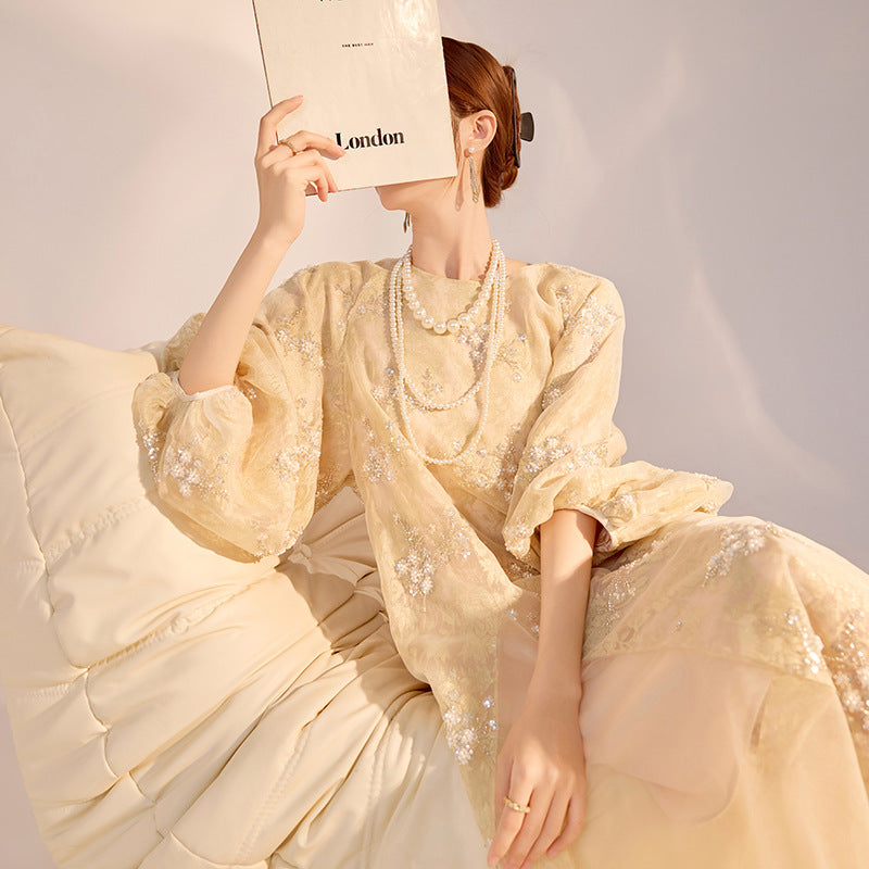 New Chinese high-end flower bead embroidered dress Guofeng light luxury design temperament long dress N2034