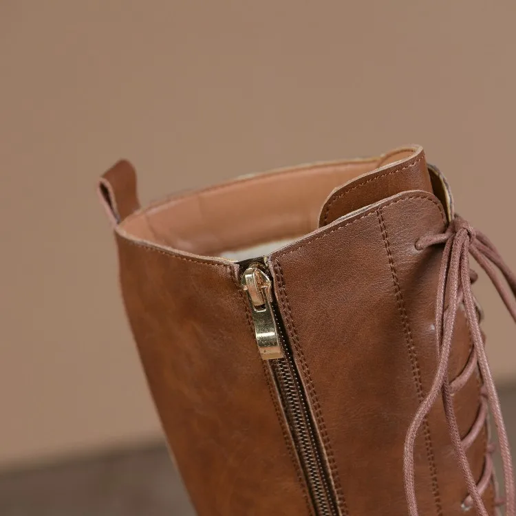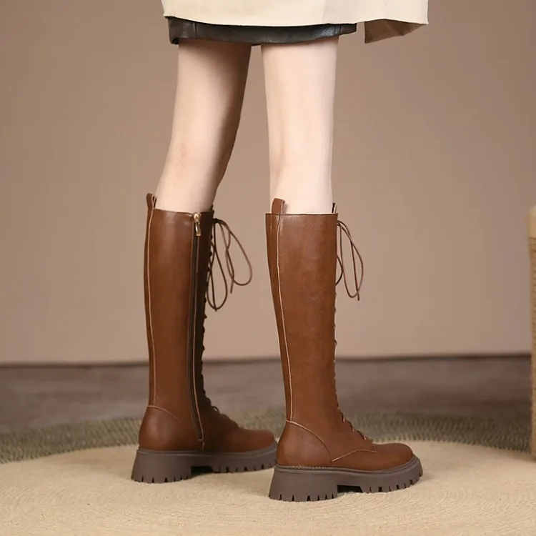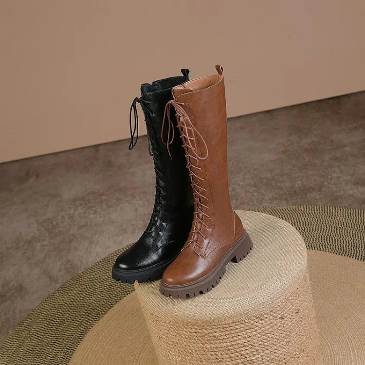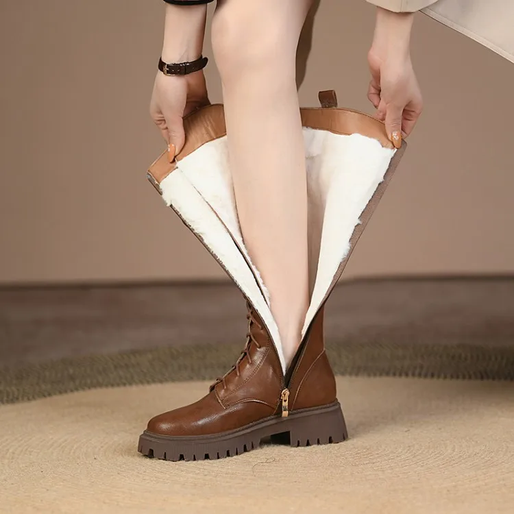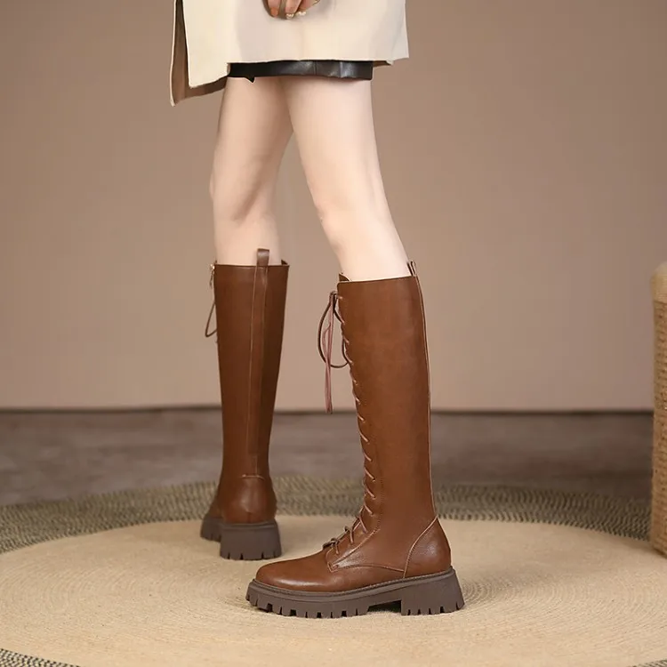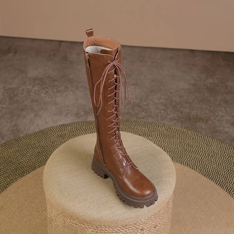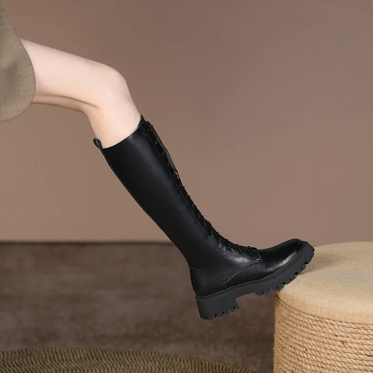 flowersverse New Knee-High Boots Winter Women Shoes Split Leather Women Boots Chunky High Boots Solid Platform Shoes For Women Knight Boots